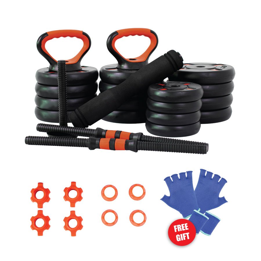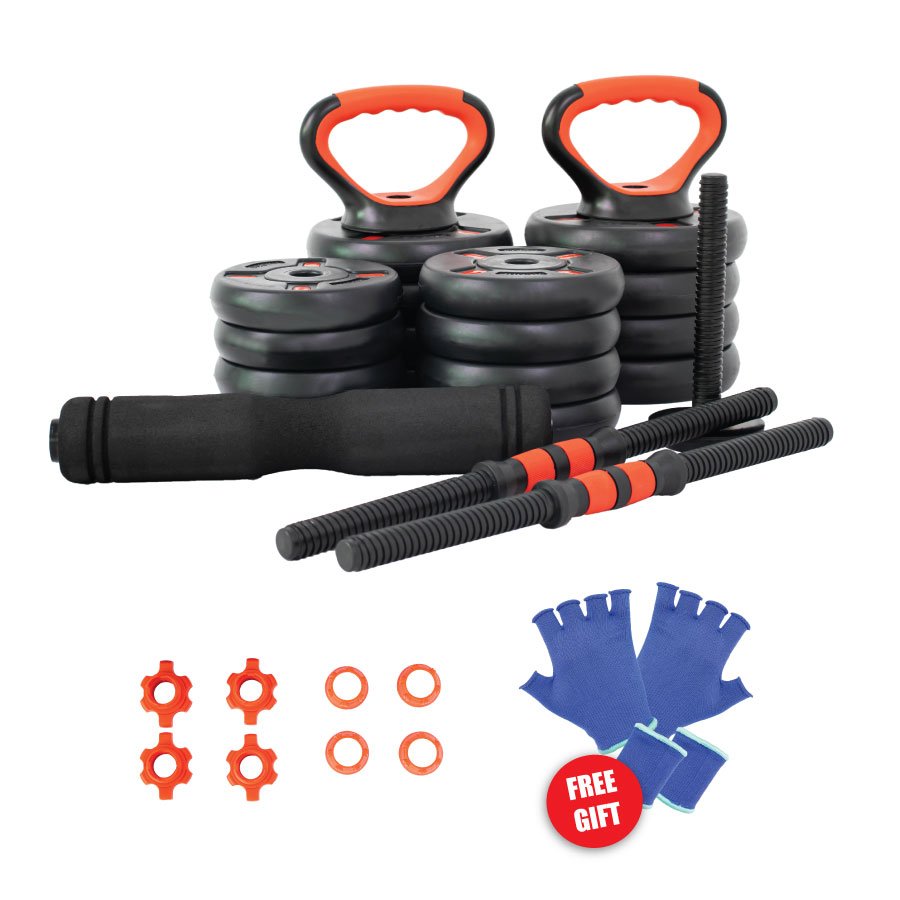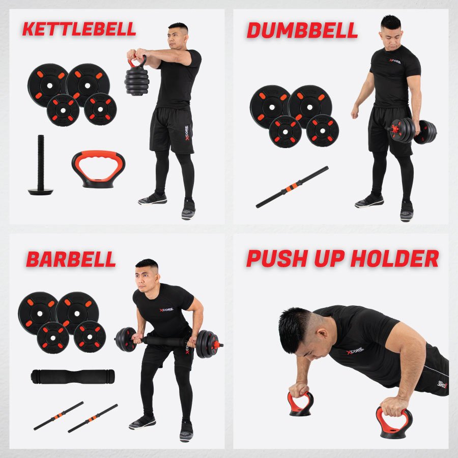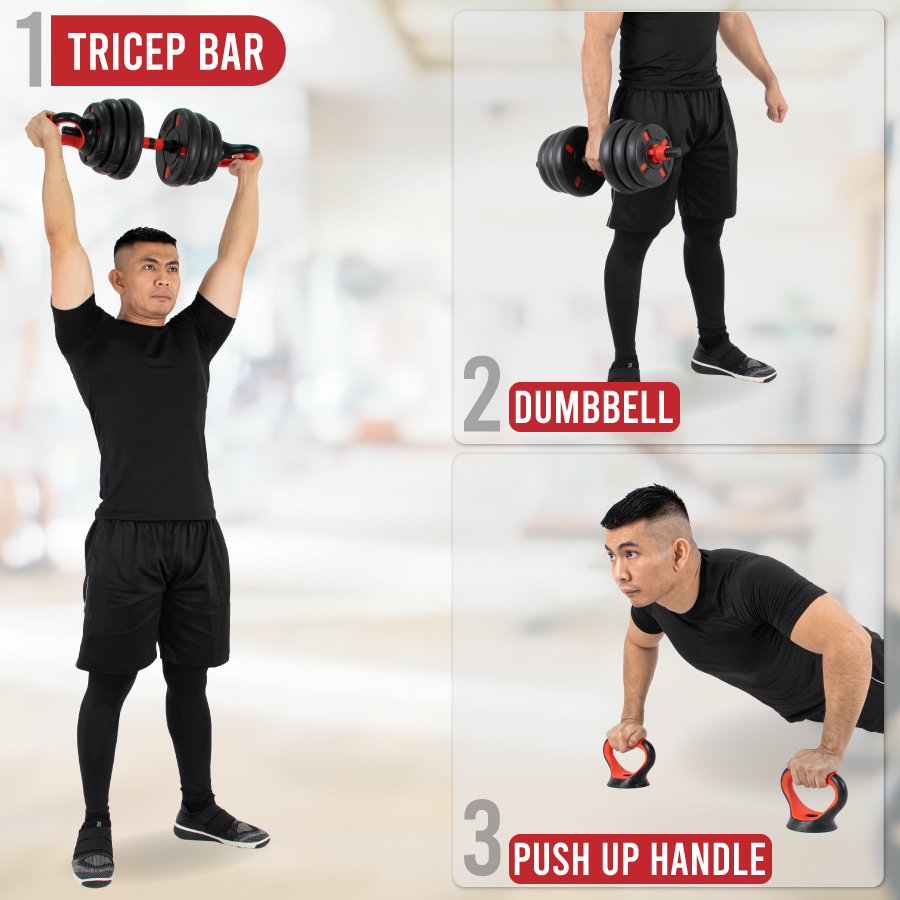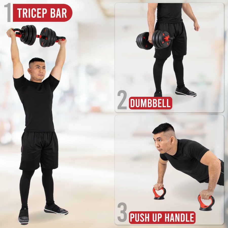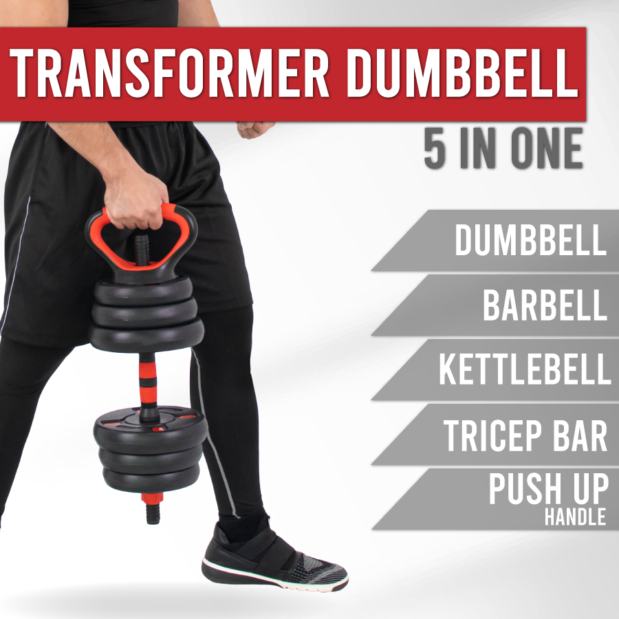 Easily transforms into a dumbbell, barbell, kettlebell, triceps bar, or push-up handle — allowing for complete full-body workouts.