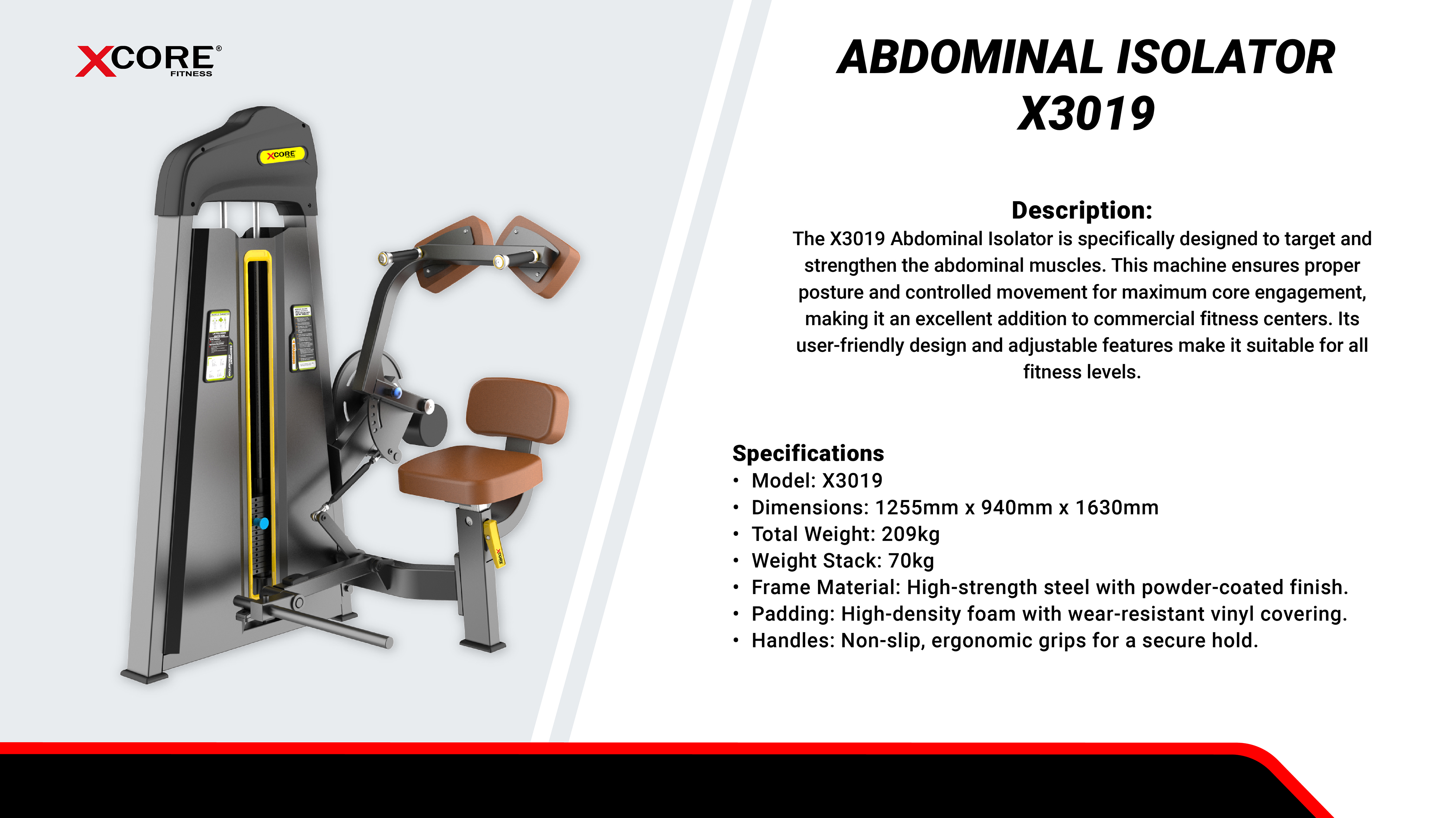 The XCORE X3019 Abdominal Isolator is designed to effectively target and strengthen the abdominal muscles, promoting better core stability and strength. With its precise biomechanics and supportive posture design, it ensures safe, controlled movement for maximum muscle activation. Ideal for commercial gyms and fitness centers, this machine accommodates users of all fitness levels.