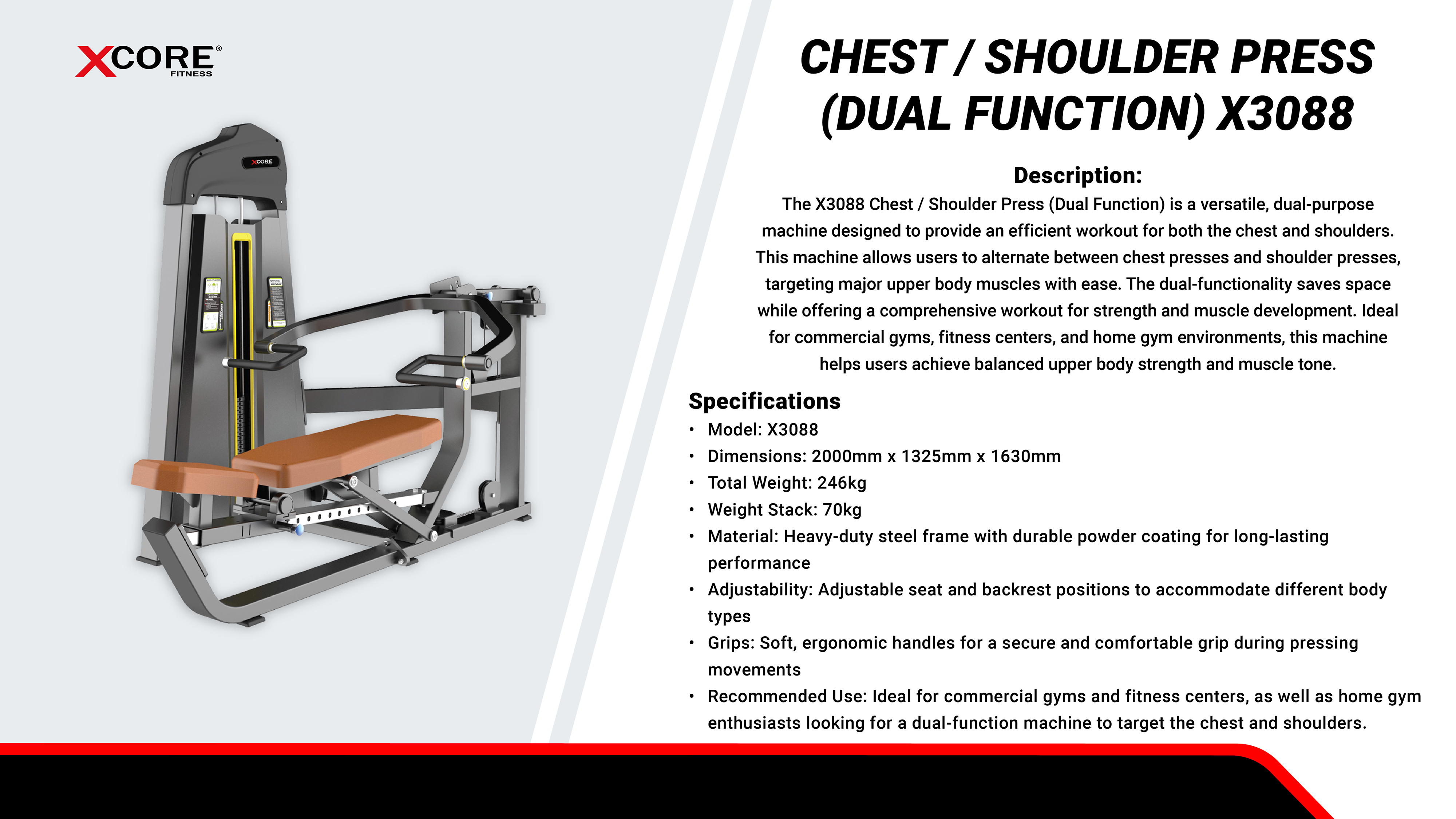 The XCORE X3088 Chest & Shoulder Press (Dual Function) delivers an efficient and space-saving solution for comprehensive upper body training. Designed to target both the chest and shoulders, it allows users to easily switch between press movements for balanced muscle development. With its smooth mechanics, adjustable seating, and ergonomic design, this dual-function unit is ideal for commercial gyms, fitness centers, and advanced home setups.