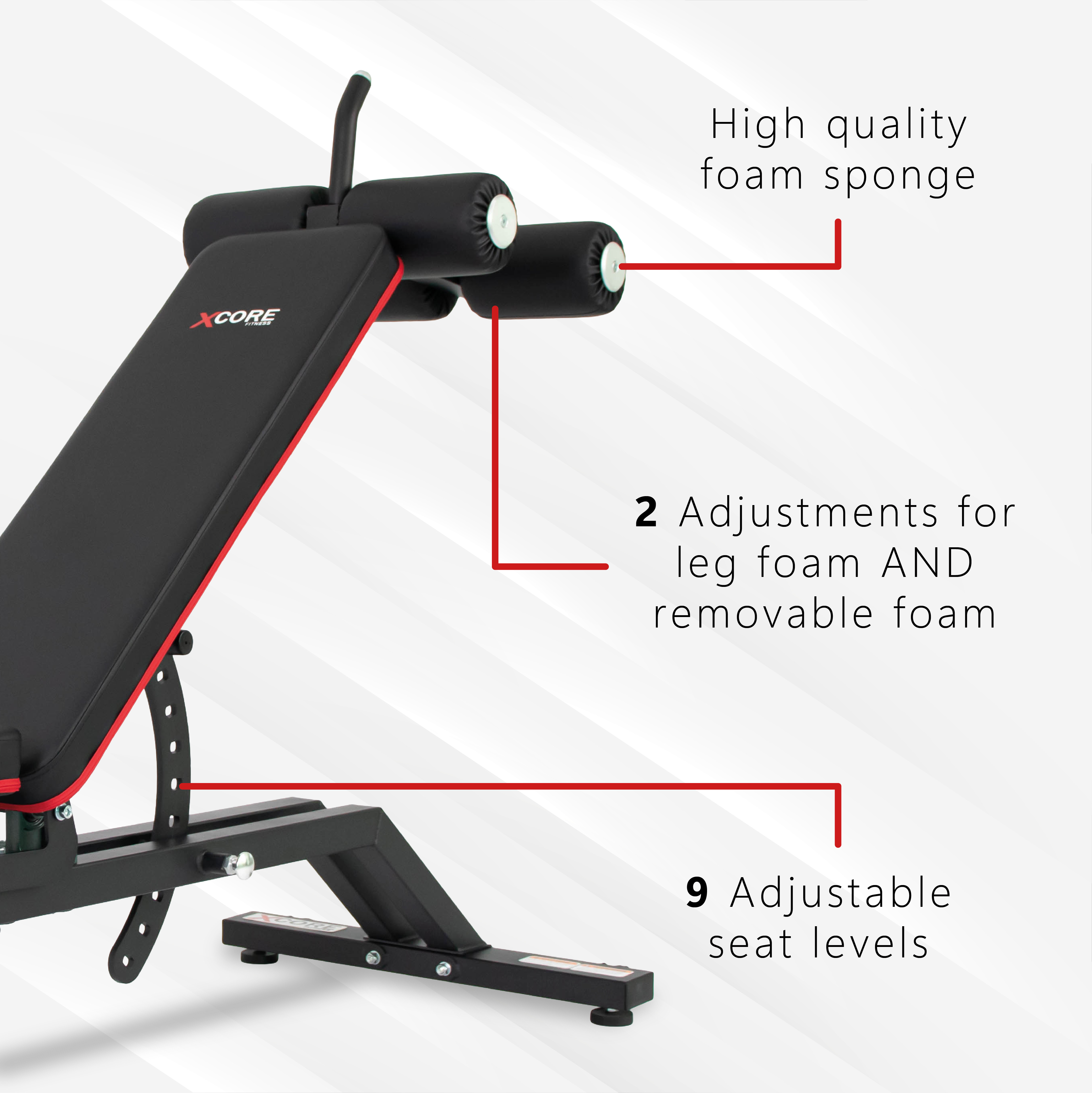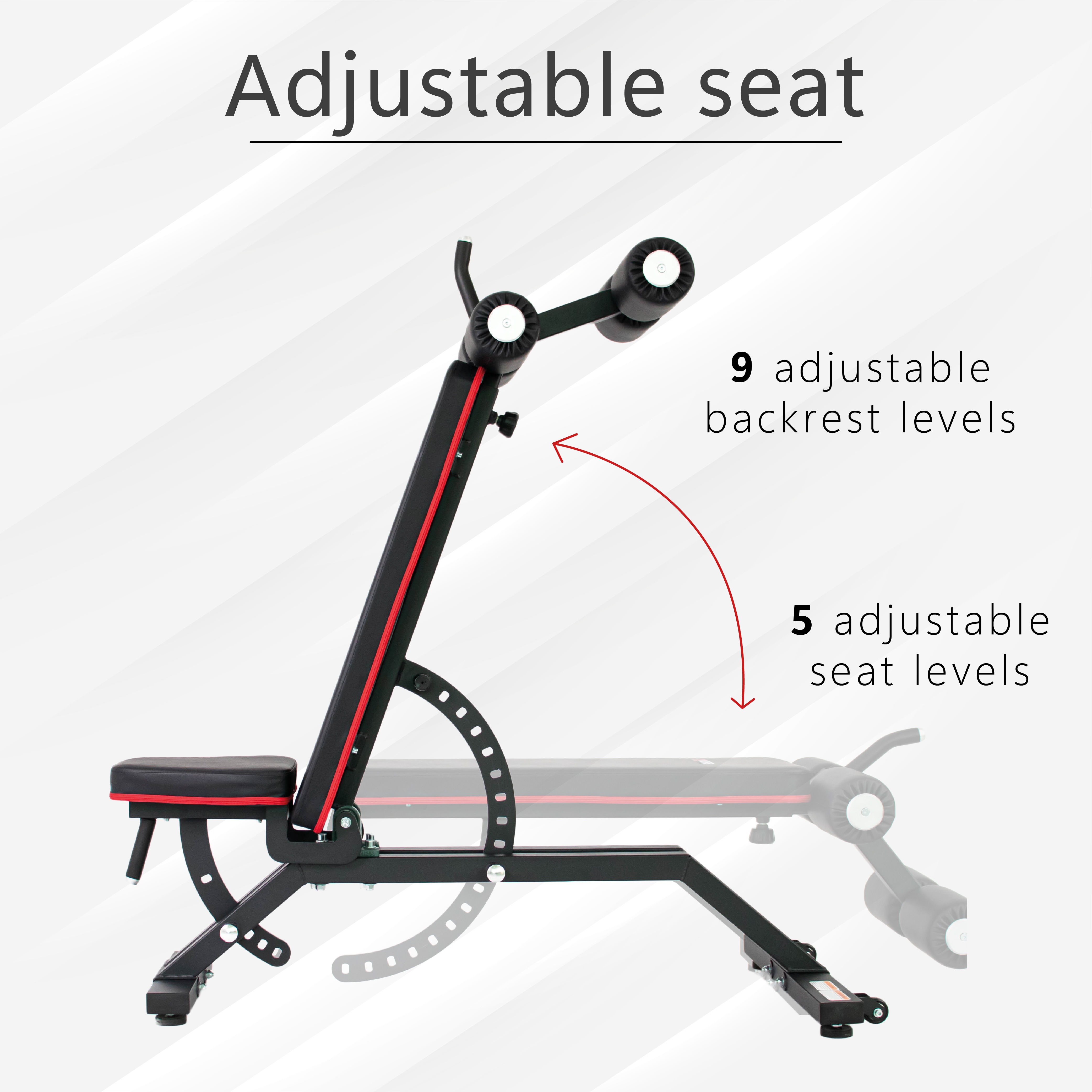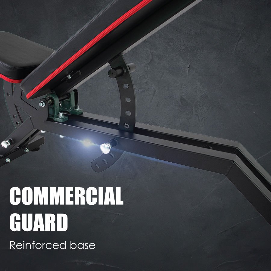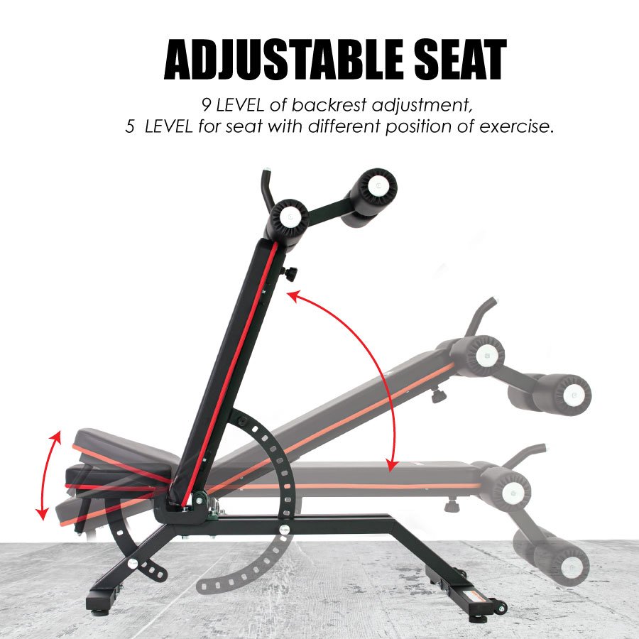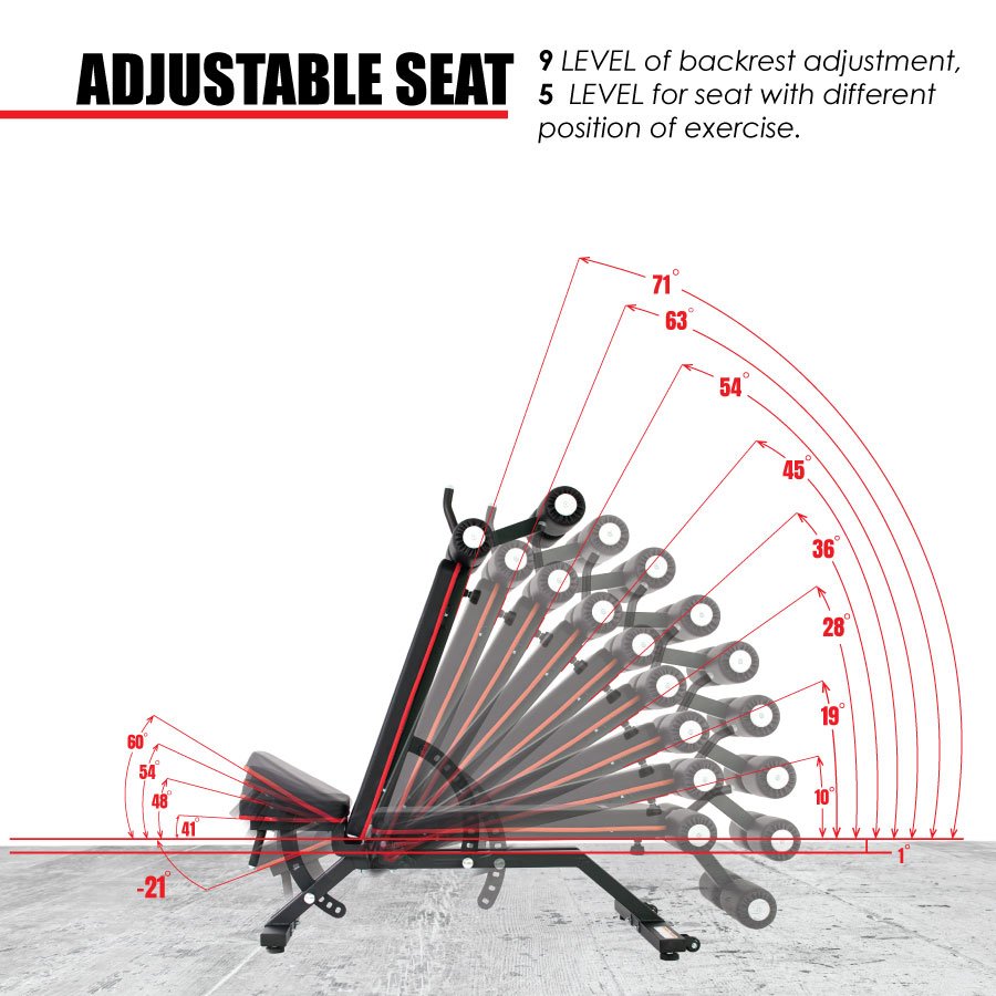 Commercial-grade bench with 9 backrest levels, 5 seat positions, and reinforced stability for full-range strength training