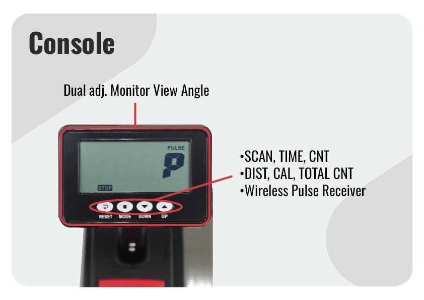 Dual adjustable monitor with display functions: Scan, Time, Count, Distance, Calories, and Total Count.