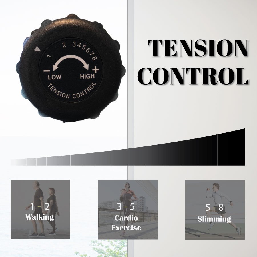 Adjust tension from light walking to slimming intensity (1–2 Walking | 3–5 Cardio | 6–8 Slimming).