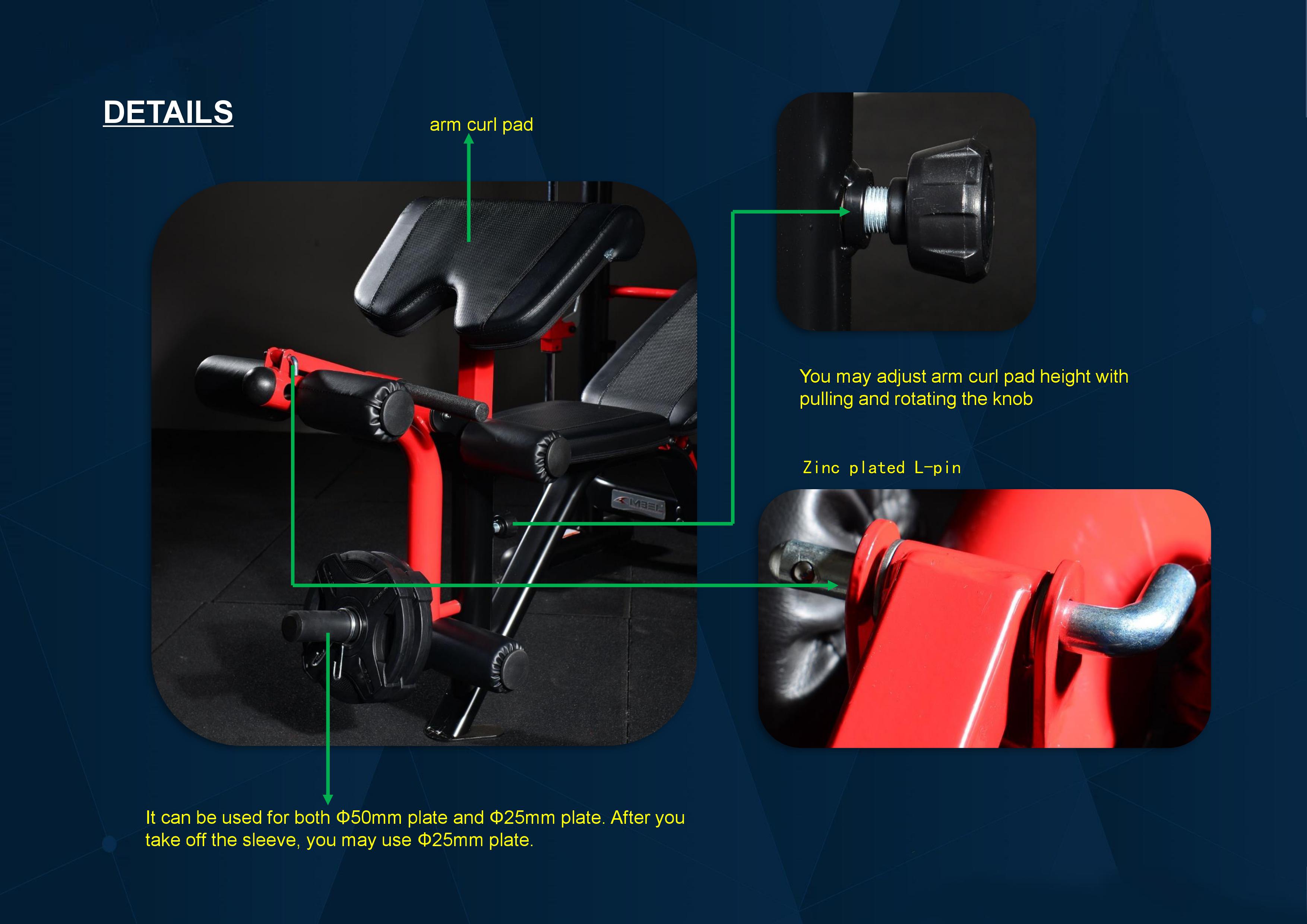 Adjust the preacher curl pad easily using the pull-and-rotate knob for different workout positions.
