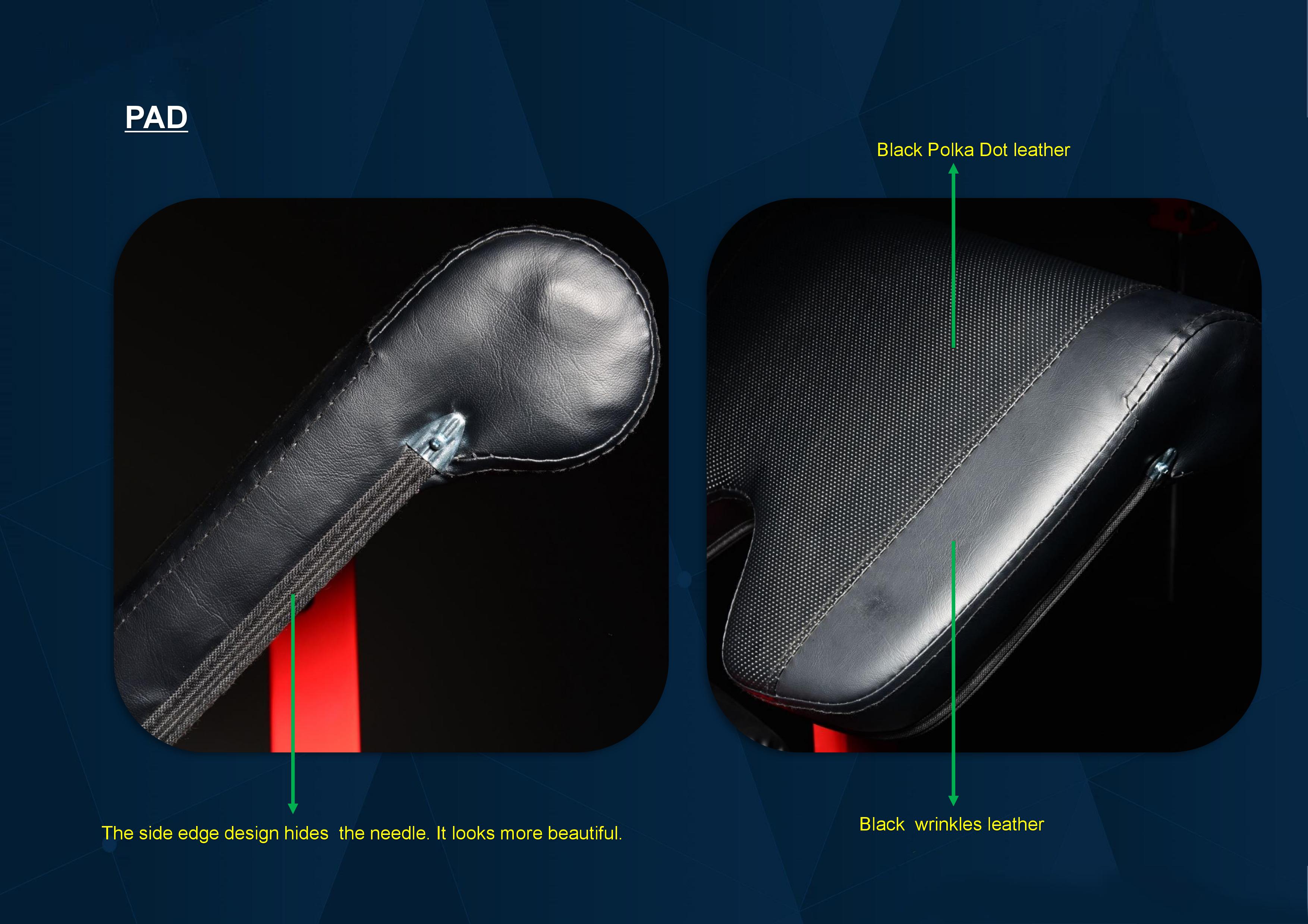 Black wrinkle leather and black polka dot leather — durable, sweat-resistant, and comfortable for long sessions.