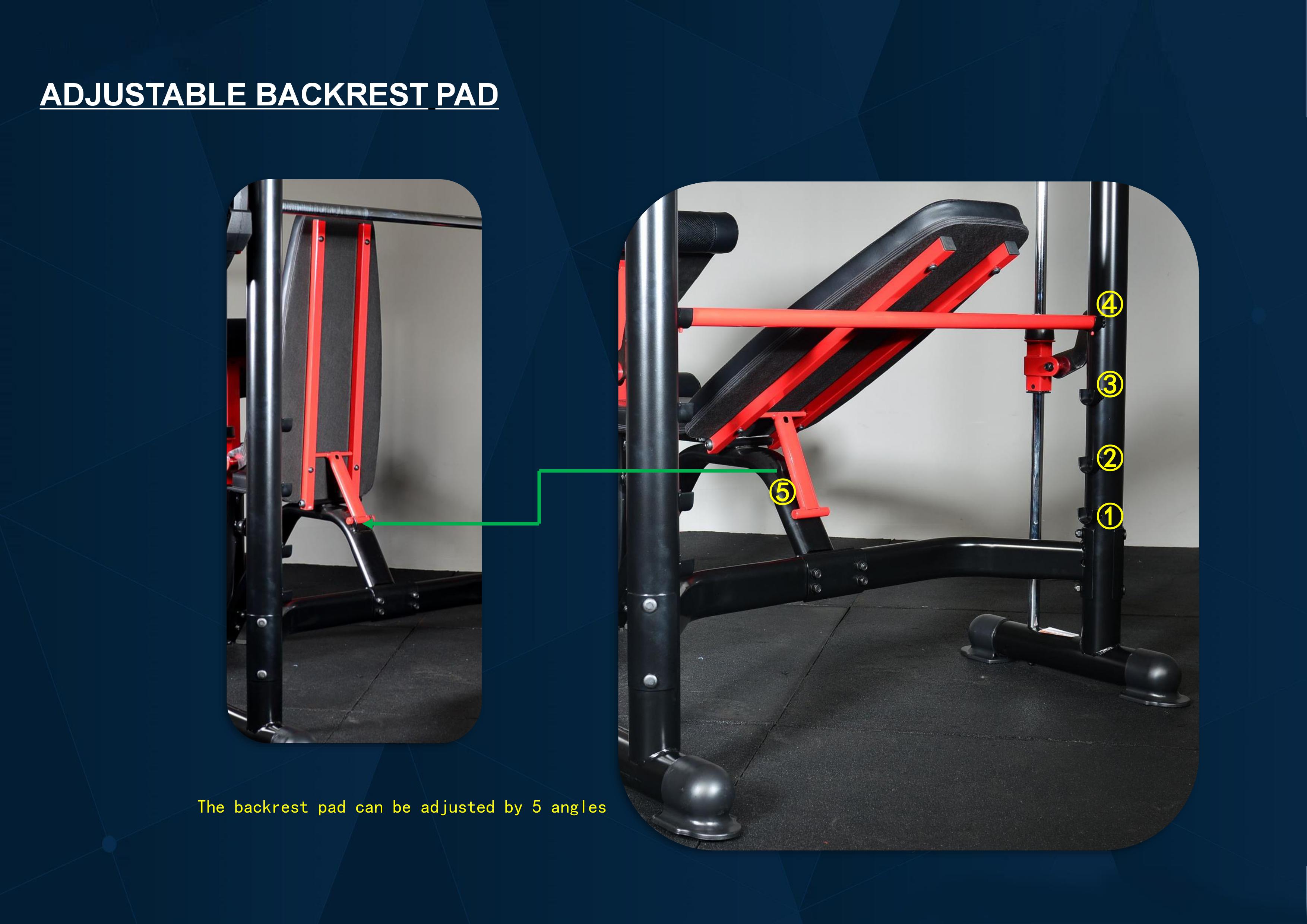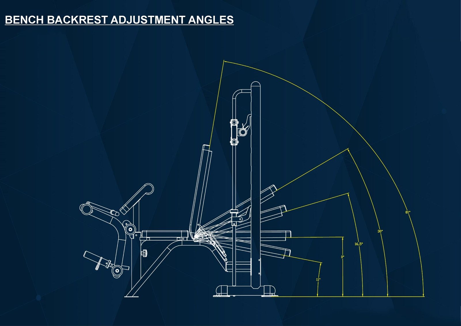 Backrest adjustable to 11°, 0°, 16.5°, 30°, and 81°, allowing incline, flat, and decline training variations.