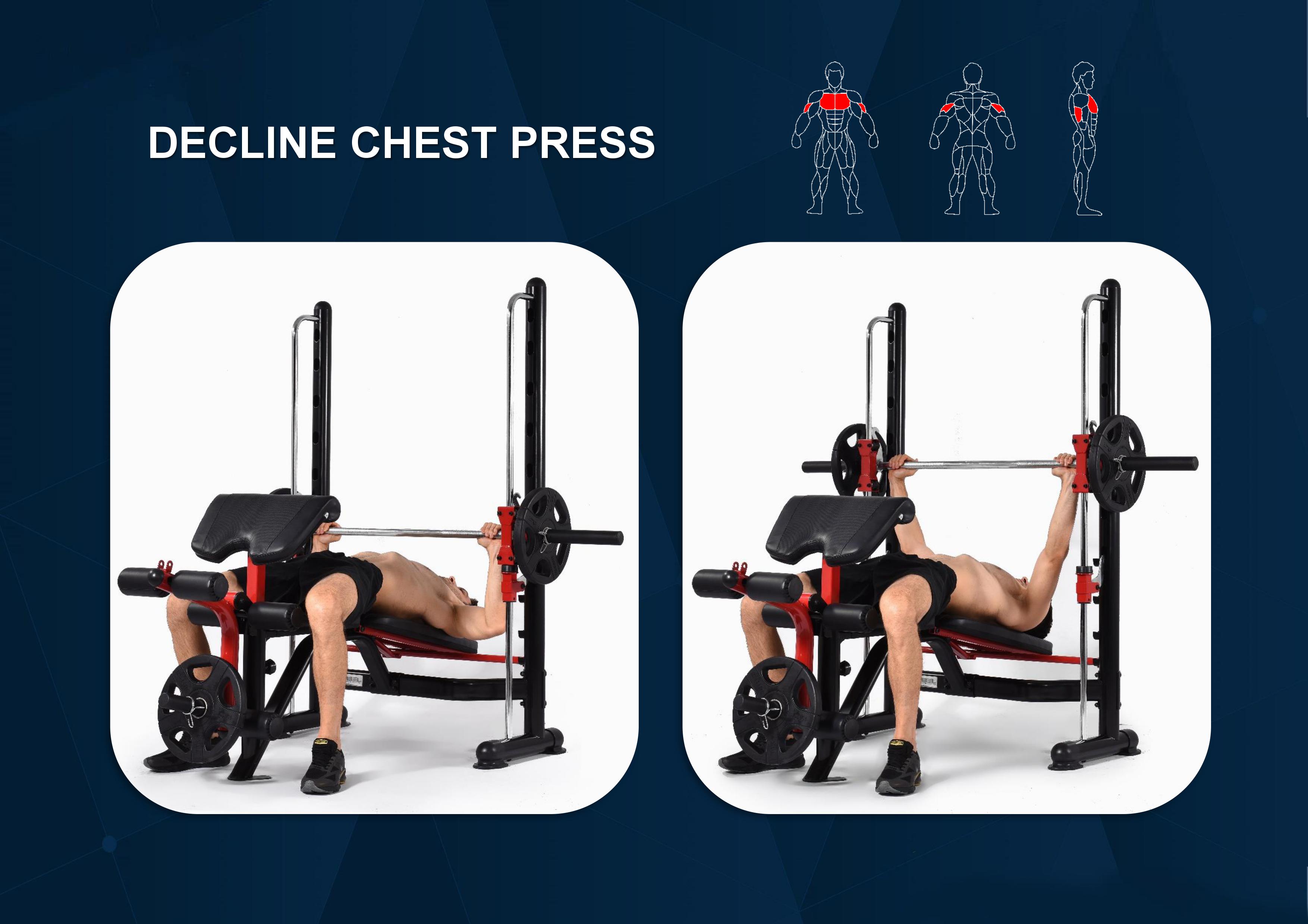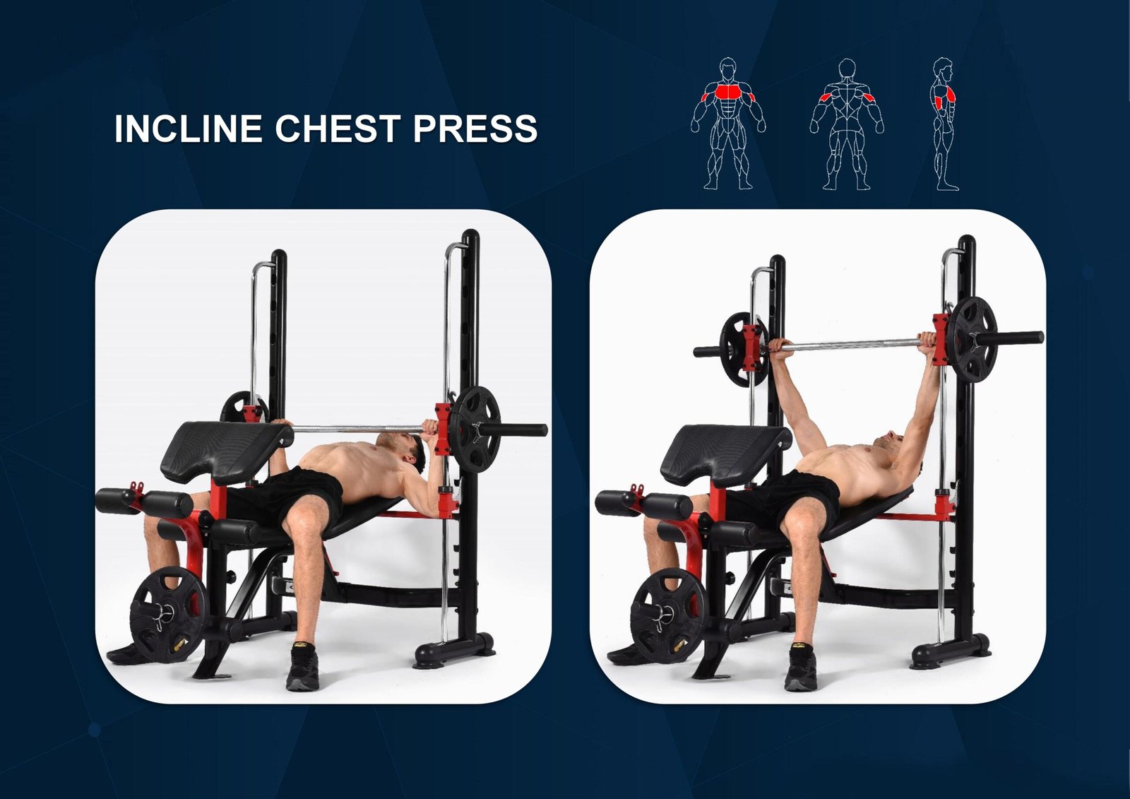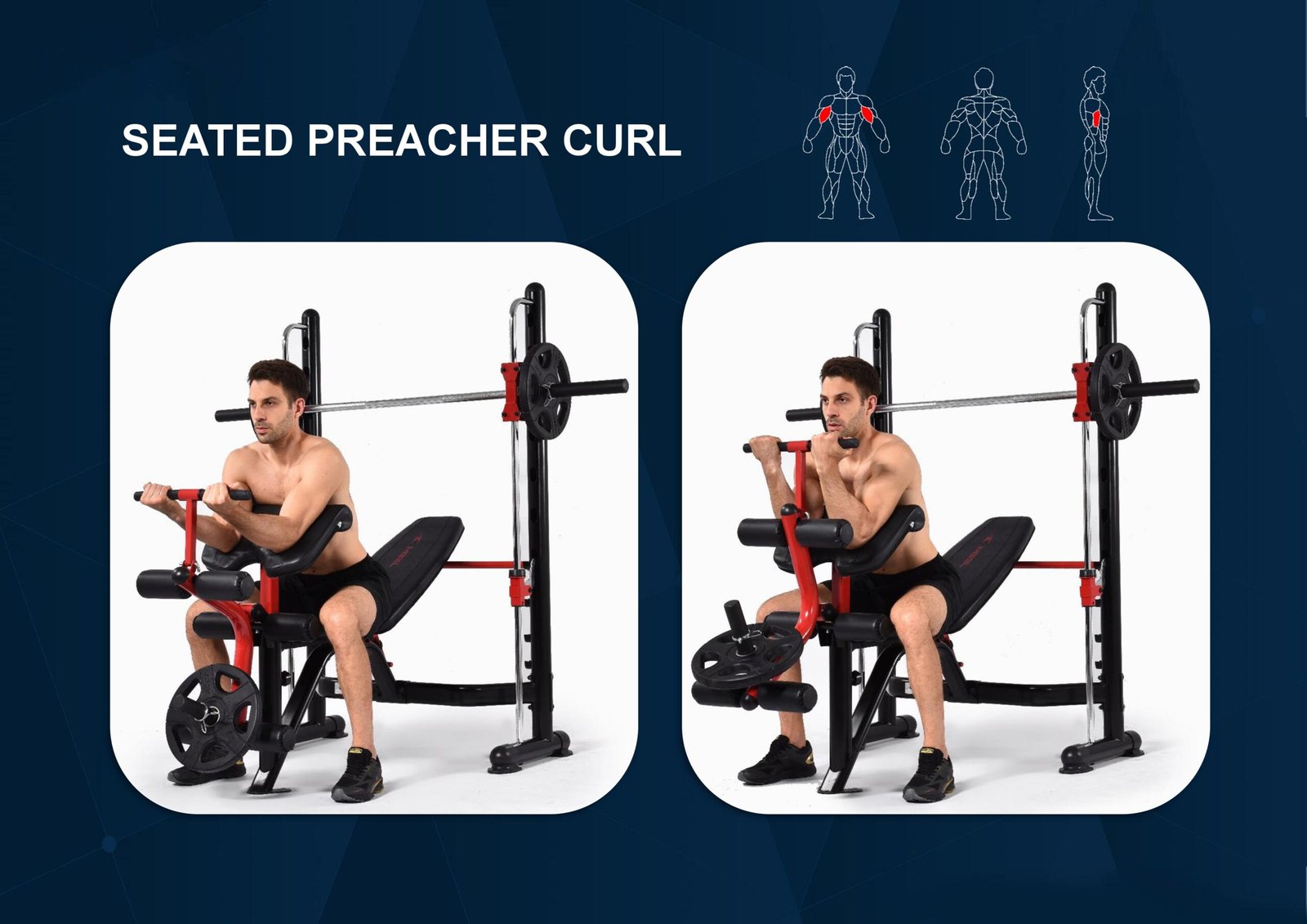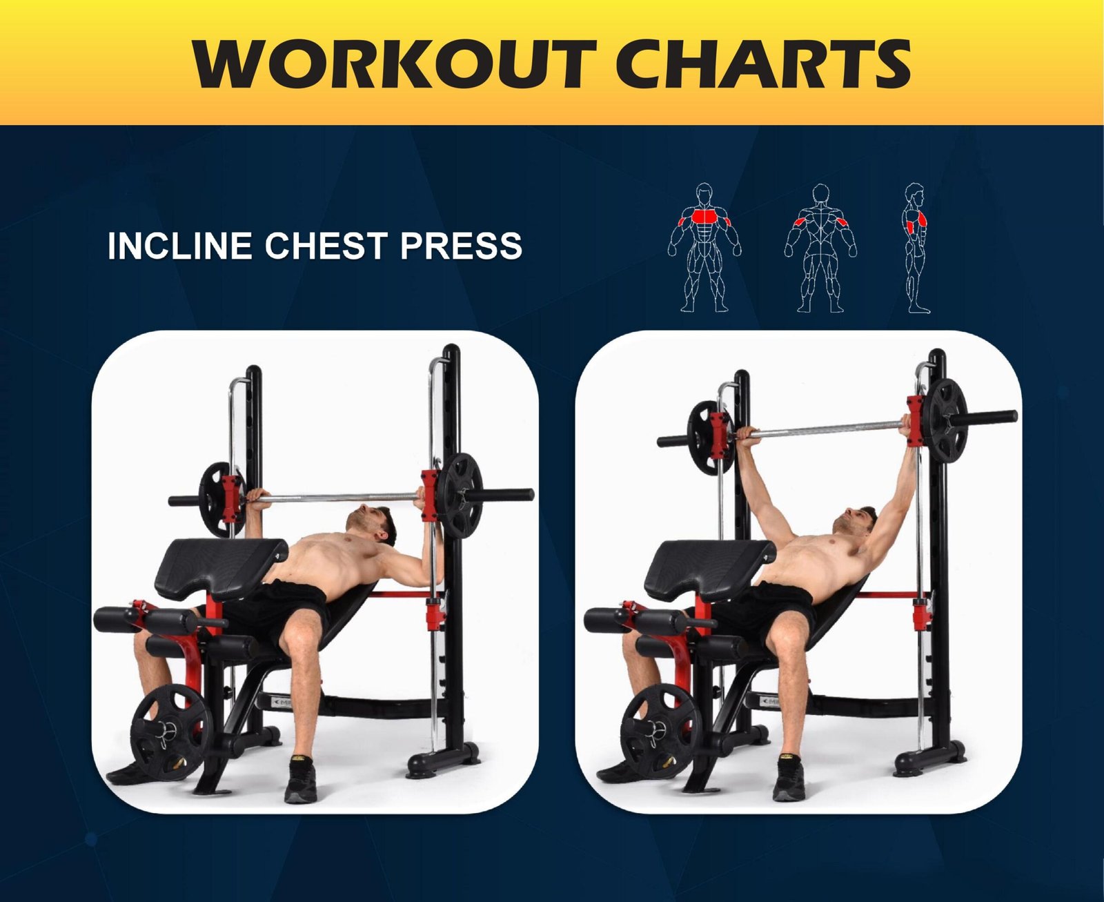 Guides users through key exercises such as Incline/Flat/Decline Chest Press, Leg Extension, Leg Curl, and Seated Preacher Curl.