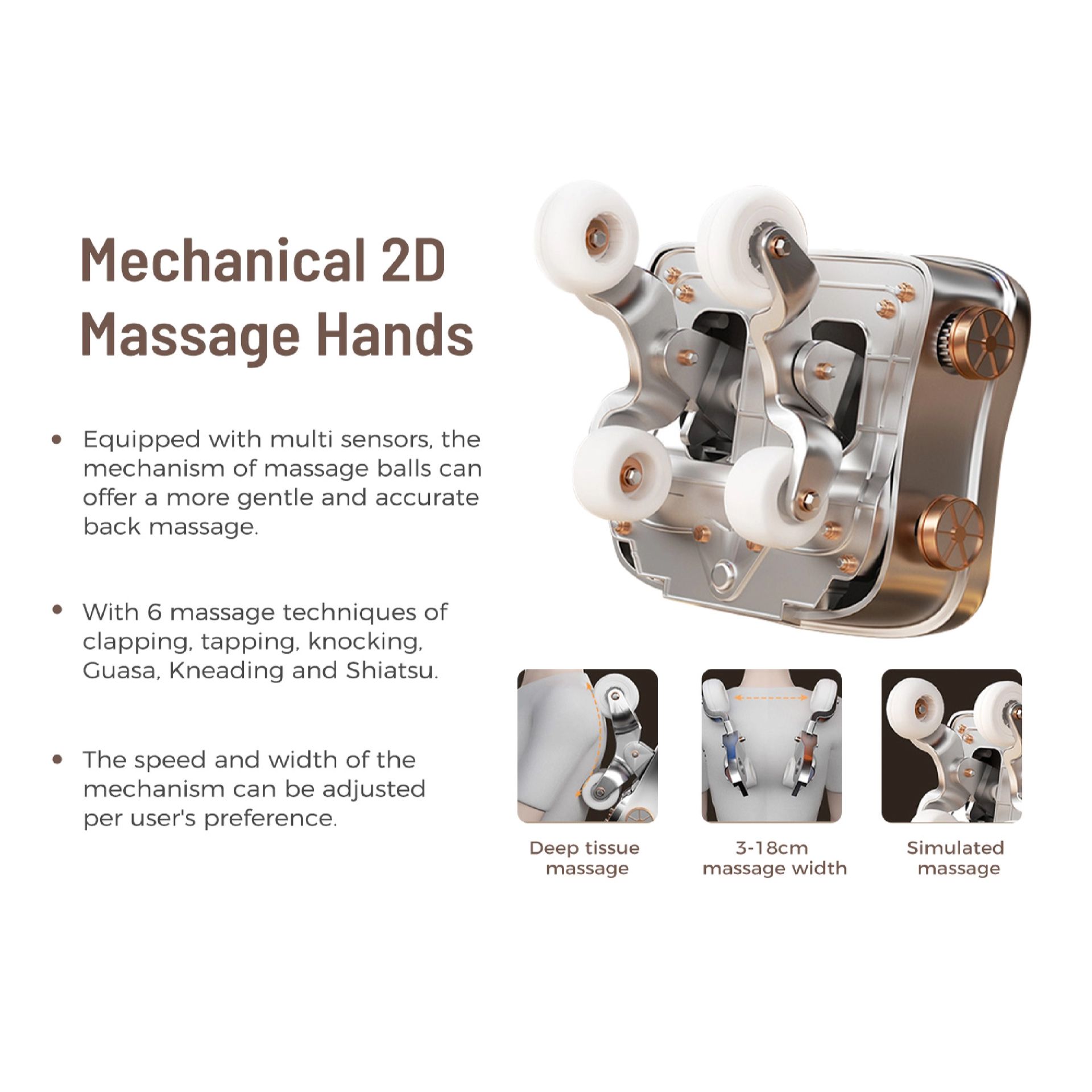 Equipped with multi-sensors; adjustable width (3–18 cm) and speed; delivers precise, deep-tissue back massage.