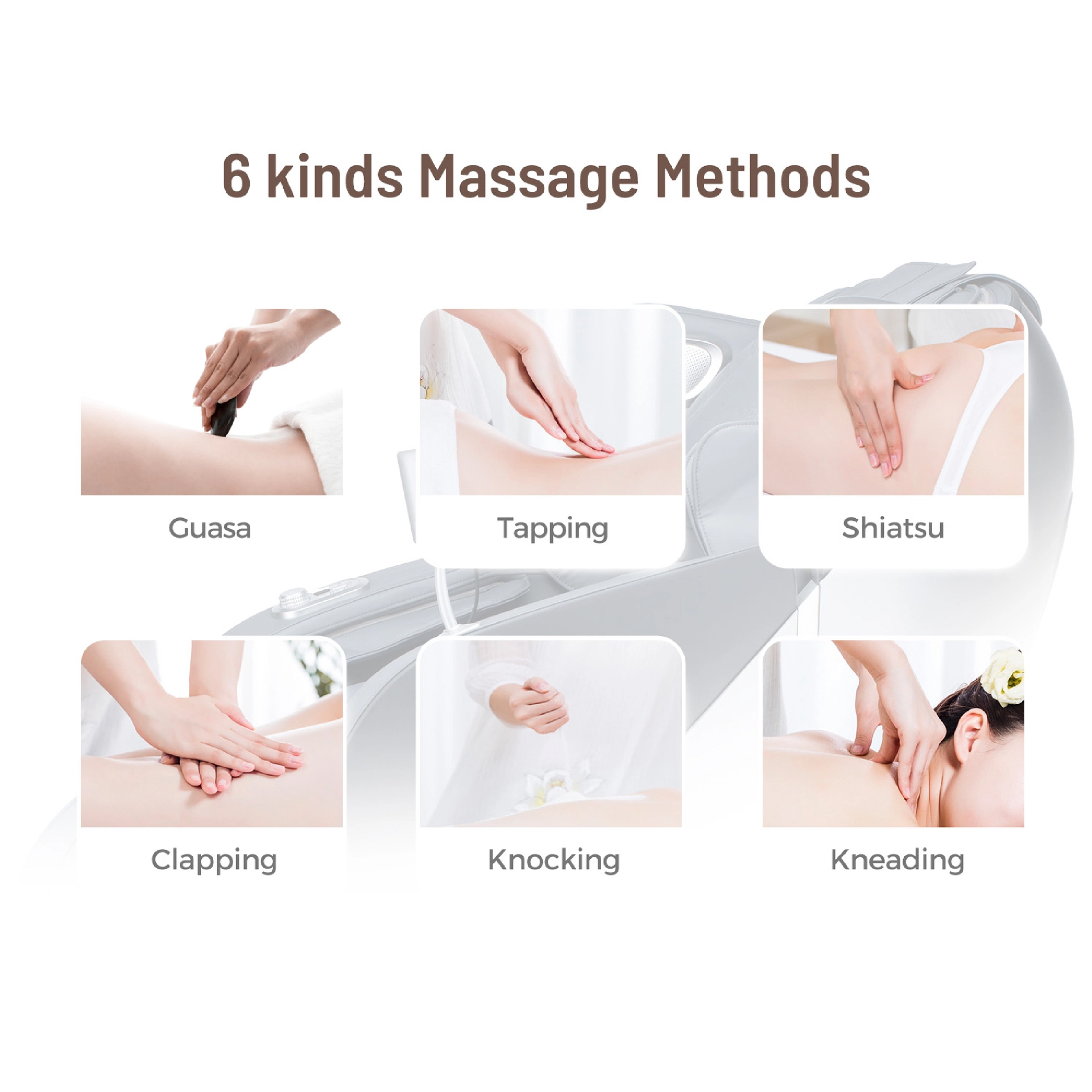 Guasa, tapping, shiatsu, clapping, knocking, and kneading for a complete massage experience.