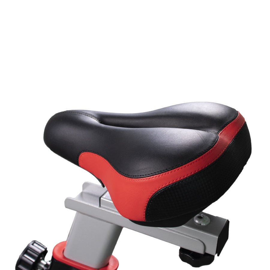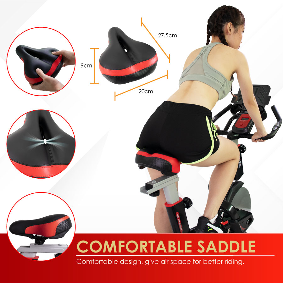 Wide padded saddle (27.5 × 20 × 9 cm) for improved comfort during long sessions.