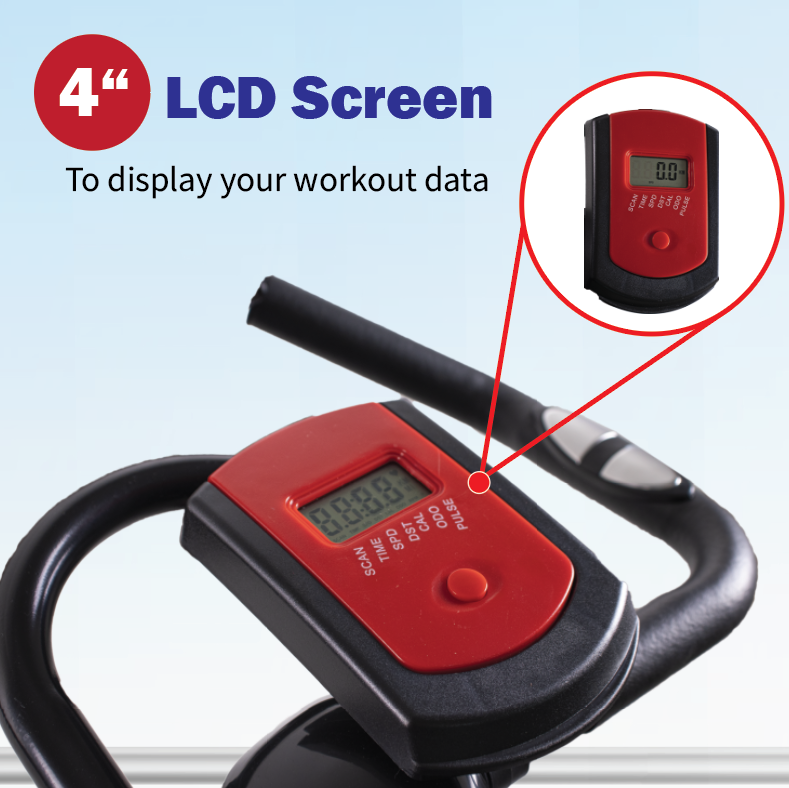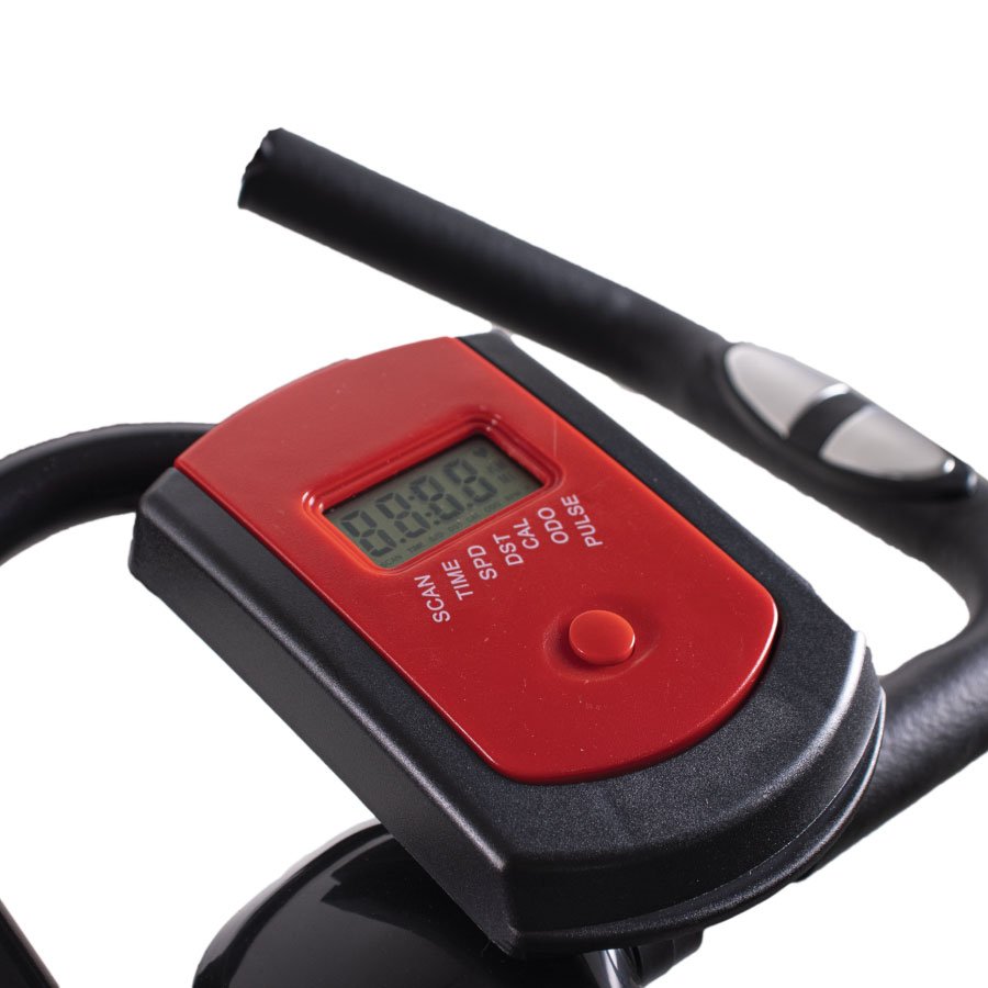 Displays scan, time, speed, distance, calories, odometer, and pulse via built-in pulse sensors.