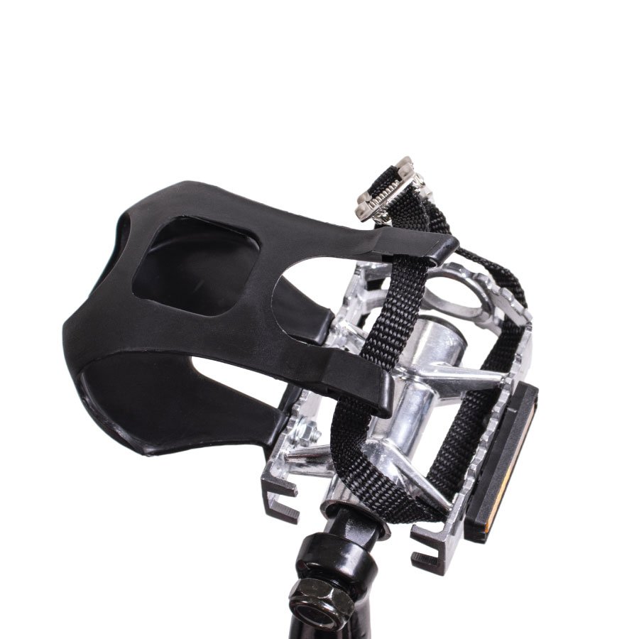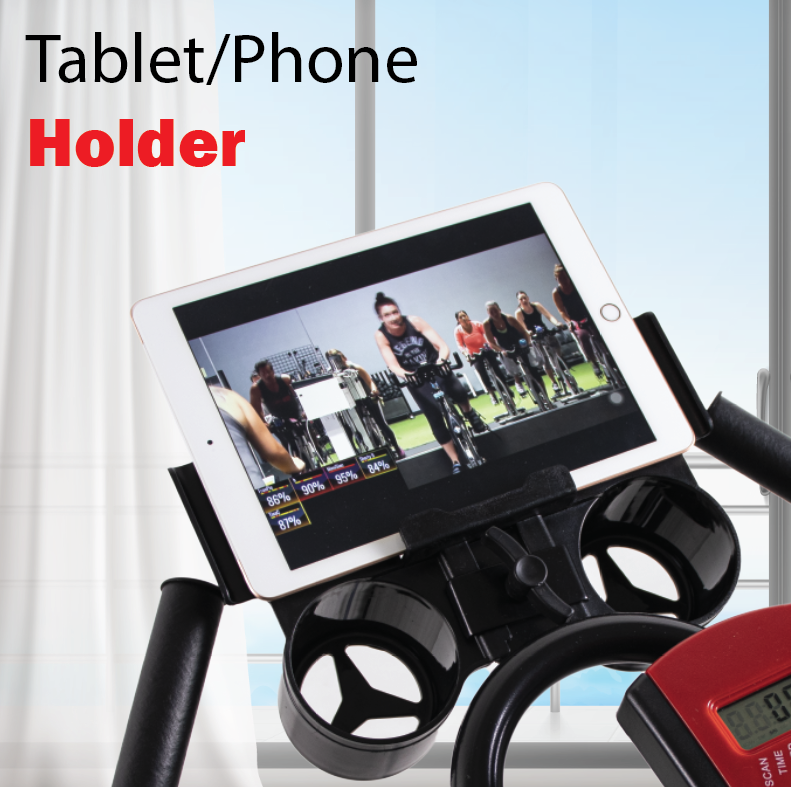 Includes iPad holder, bottle holder, pedal cages with adjustable straps, and transport wheels for easy movement.