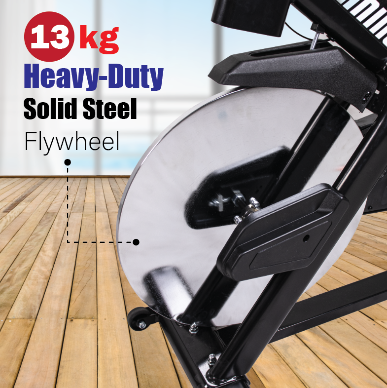 Built with a heavy-duty steel frame and 13 kg flywheel for powerful, smooth, and stable indoor cycling performance