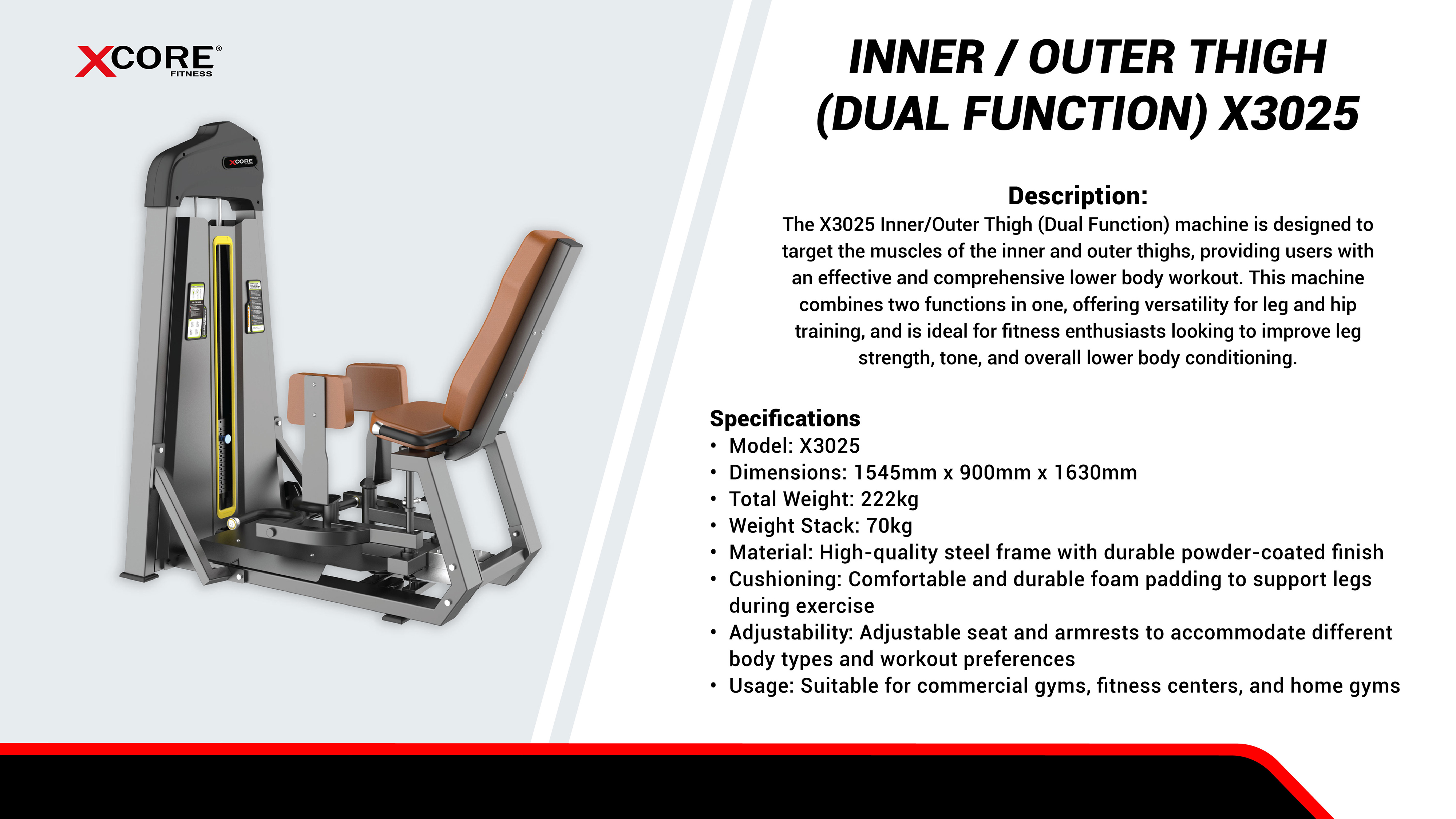 The XCORE X3025 Inner & Outer Thigh (Dual Function) machine provides a complete lower body training solution by combining abduction and adduction exercises in one compact unit. Designed for efficiency and comfort, this machine effectively targets the inner and outer thigh muscles, enhancing leg strength, balance, and overall lower body conditioning. Ideal for commercial gyms, fitness centers, and home setups, it delivers both performance and versatility.