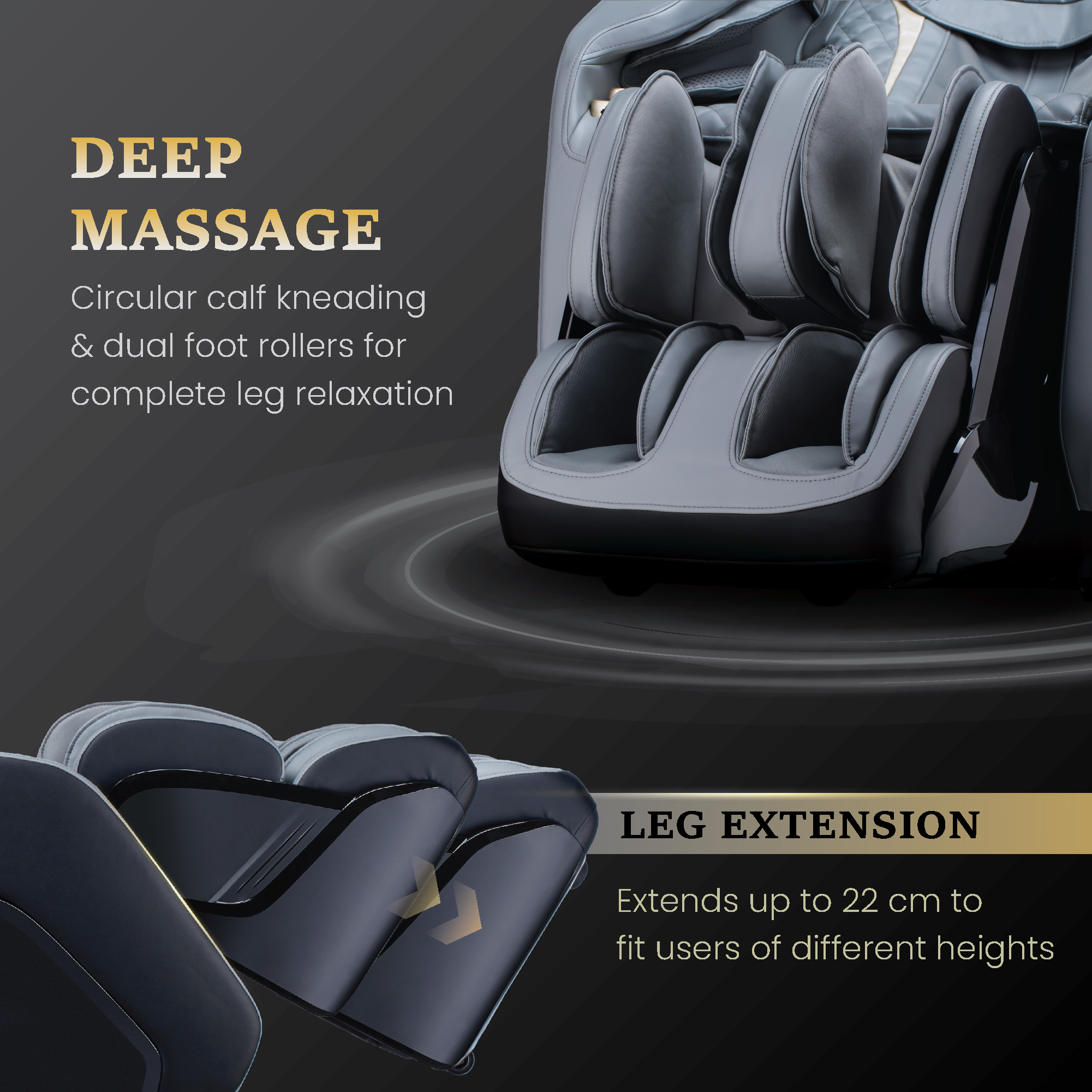 Circular calf kneading with dual foot rollers for complete lower-body relaxation.