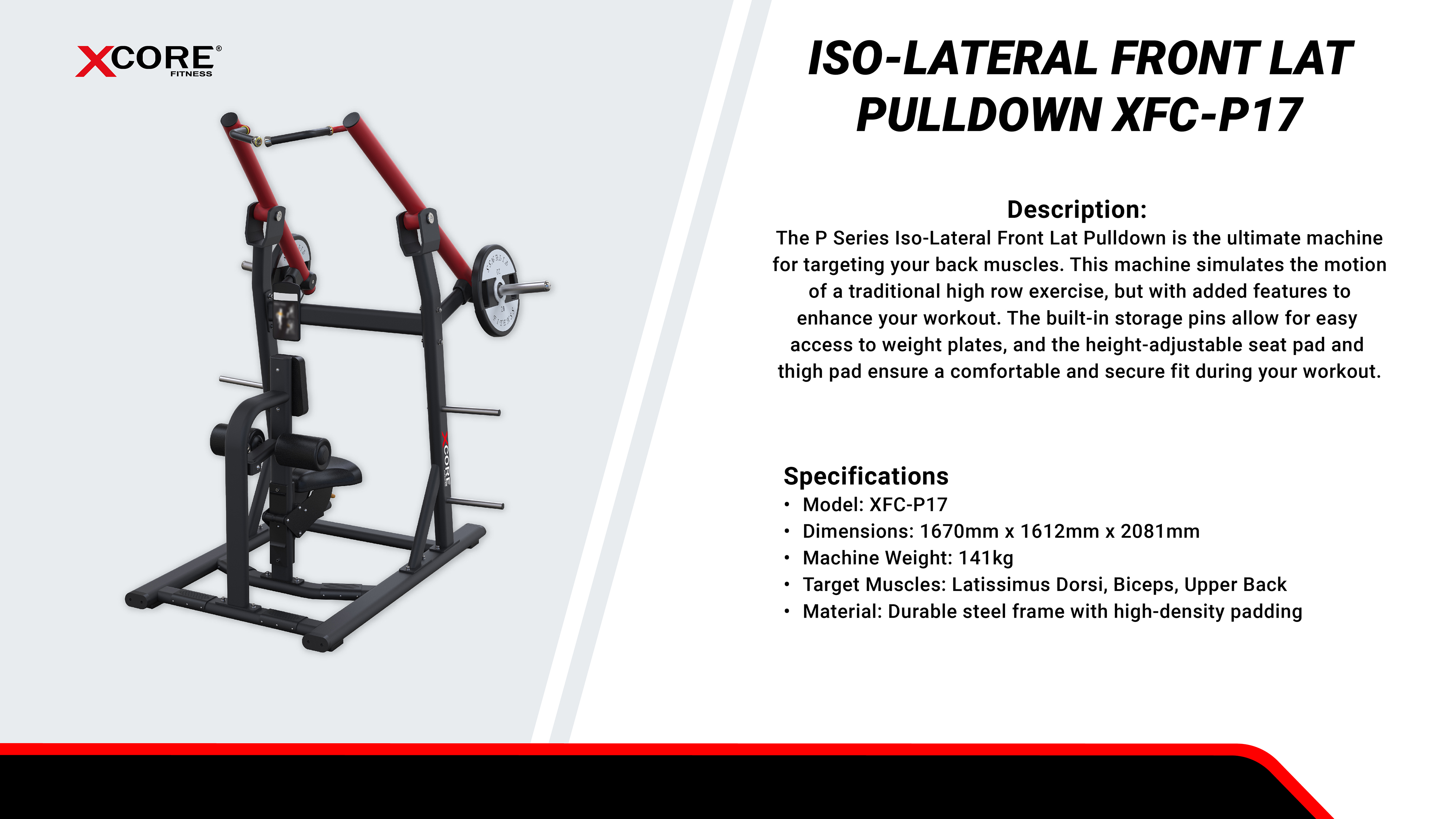 The XCORE P Series Iso-Lateral Front Lat Pulldown is engineered to maximize upper back and lat development through a natural, controlled movement path. It replicates the mechanics of a high row while offering independent arm motion for balanced strength gains and improved symmetry.