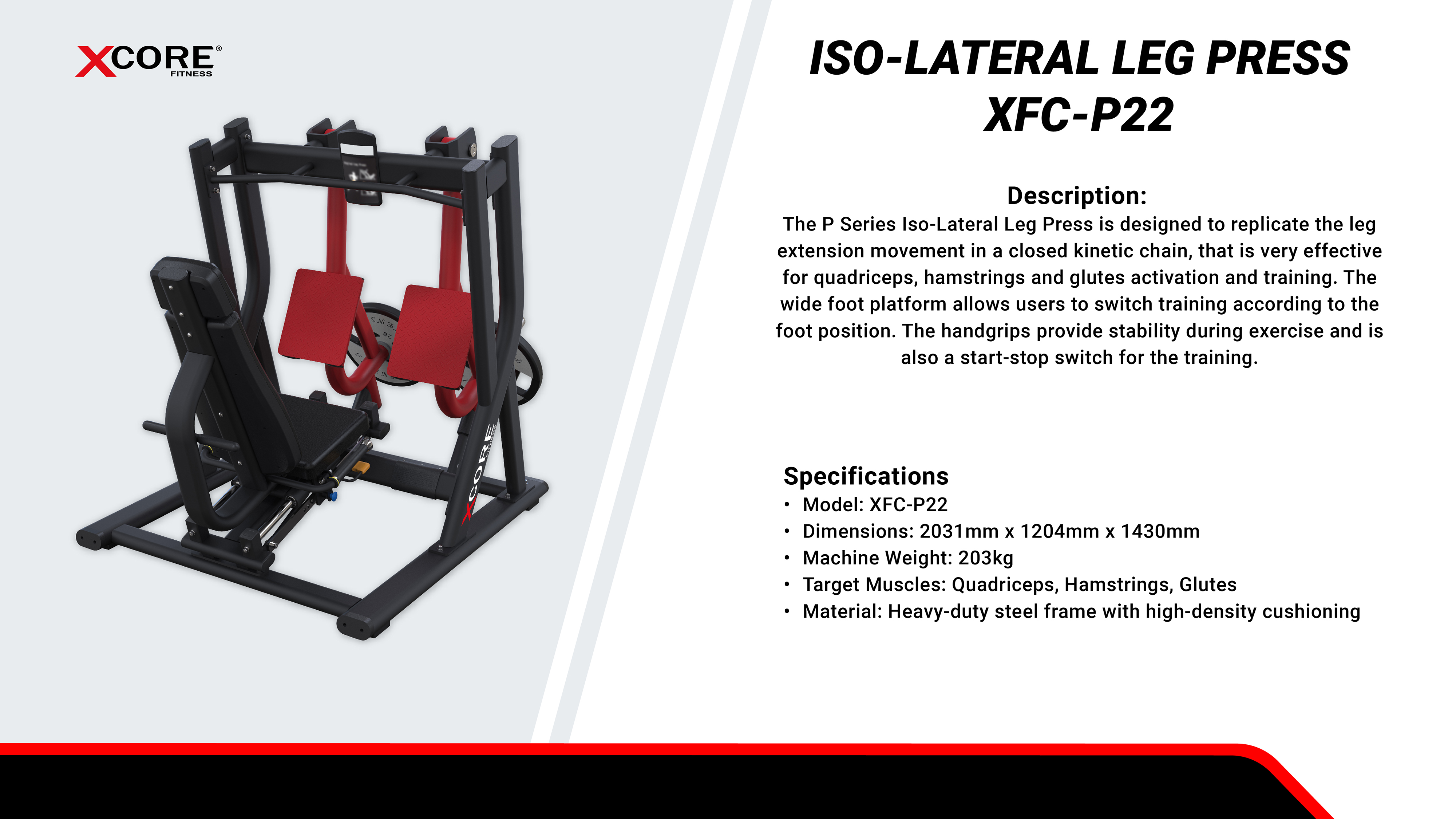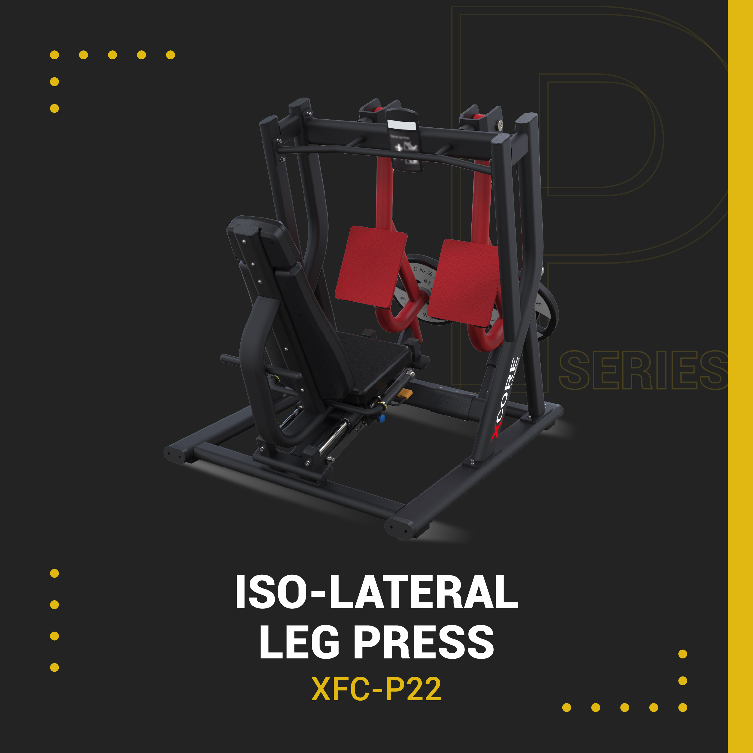 The XCORE P Series Iso-Lateral Leg Press provides a natural and balanced lower-body workout, replicating leg extension movements in a closed kinetic chain. This design ensures even strength development while minimizing stress on the joints, making it ideal for professional training environments.