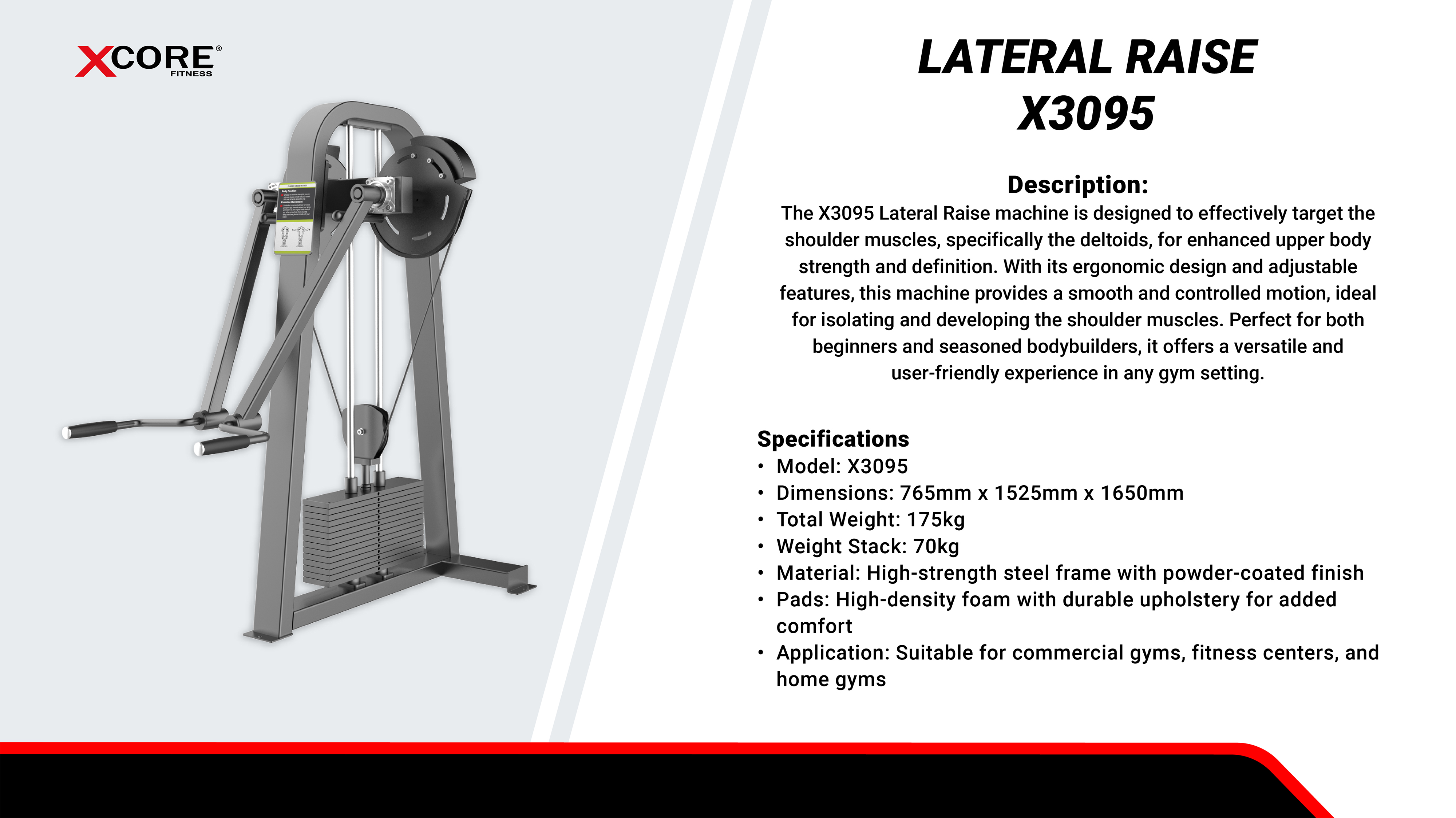 The XCORE X3095 Lateral Raise is engineered to isolate and strengthen the shoulder muscles, particularly the deltoids, promoting upper body balance, power, and definition. With an ergonomic design and smooth resistance system, this machine delivers precise motion control, ensuring safety and performance for all user levels. Ideal for commercial gyms, fitness centers, and home training spaces, it combines professional-grade construction with comfort and usability.