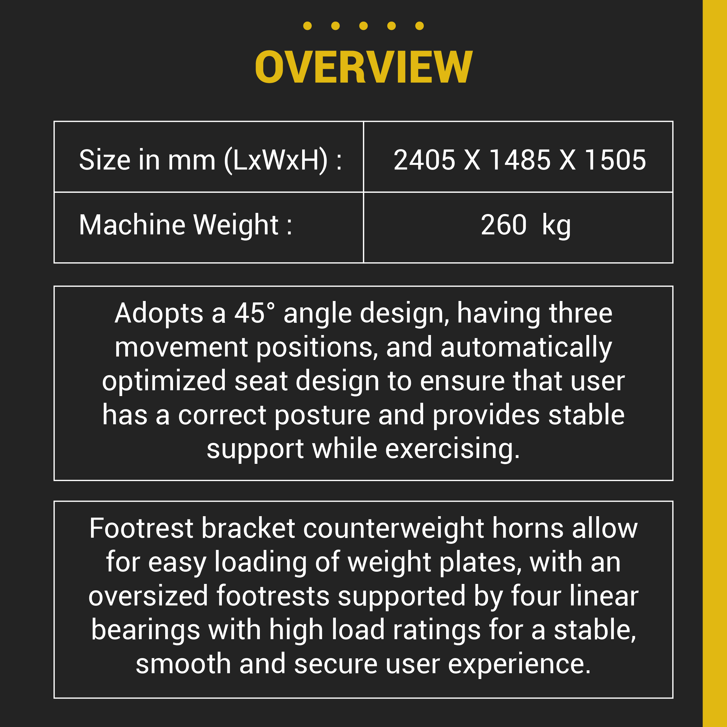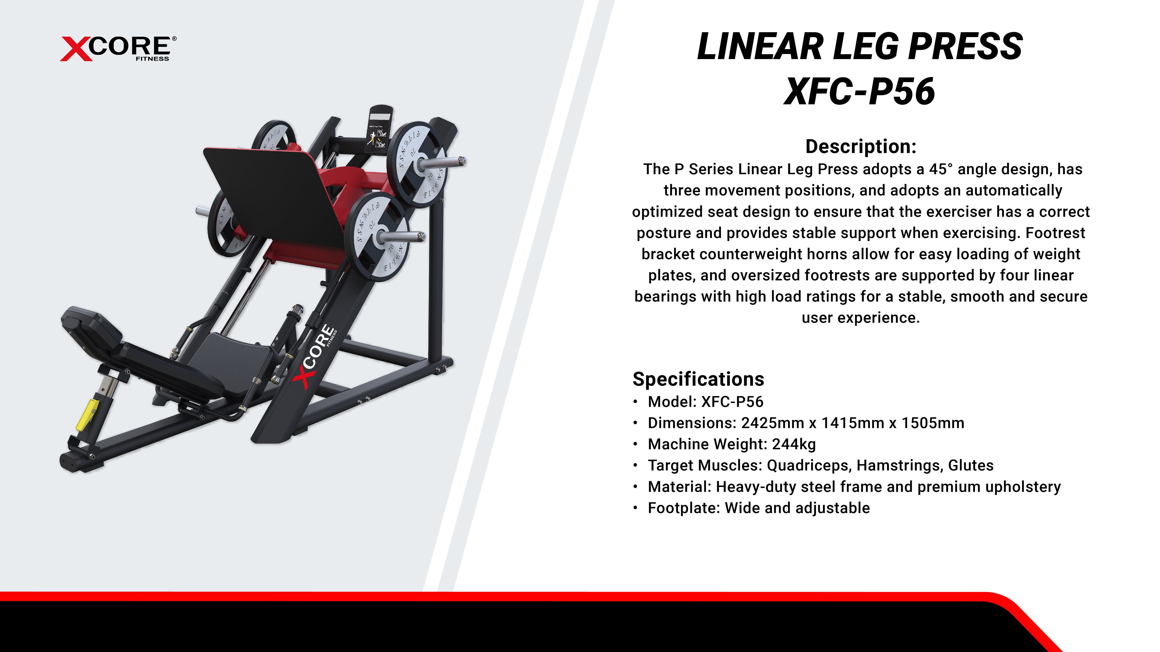 The P Series Linear Leg Press features a 45° angled design that provides smooth, biomechanically efficient lower body training. With three movement positions and an automatically optimized seat, users maintain correct posture and stability throughout the workout. The oversized footplate, supported by four high-load linear bearings, ensures a stable and secure pressing motion for all fitness levels.