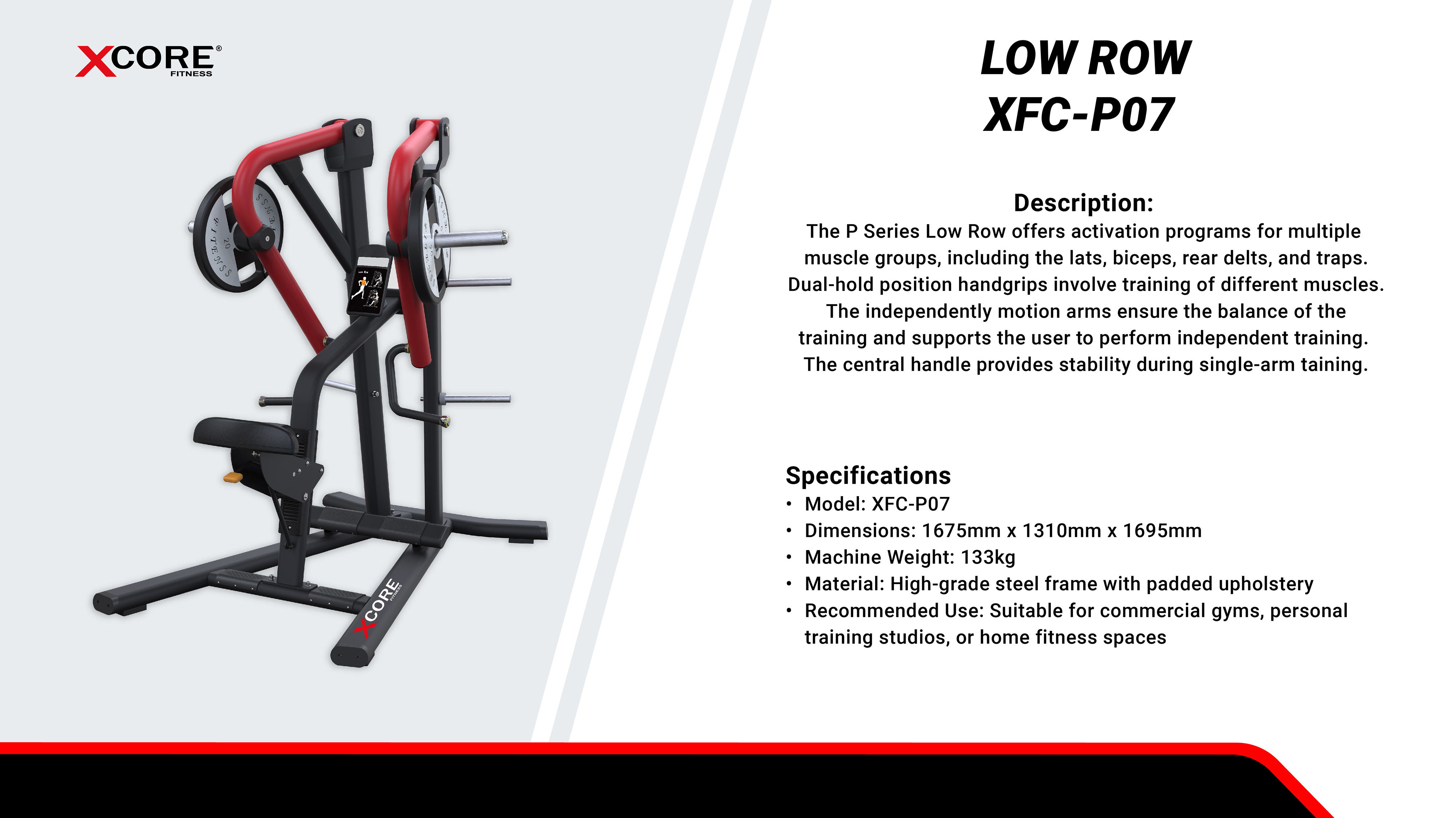 The XCORE P Series Low Row is designed to develop the lats, traps, and biceps through a natural rowing motion. With independent motion arms and dual-position handgrips, it ensures balanced training and allows both unilateral and bilateral exercises. Built with a heavy-duty steel frame, it’s perfect for high-intensity, long-term use in any commercial or professional setting.