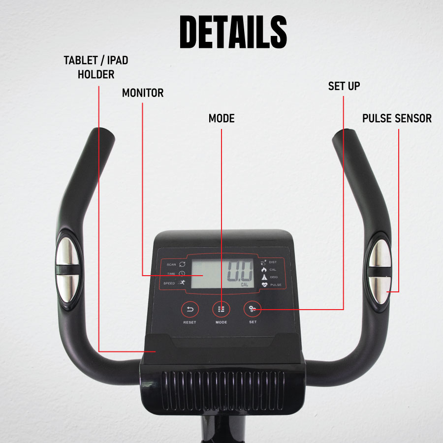 Digital control panel equipped with LCD monitor, Mode, and Setup functions — allows users to easily track and manage workout data including Time, Distance, Calories, Odometer, and Pulse.