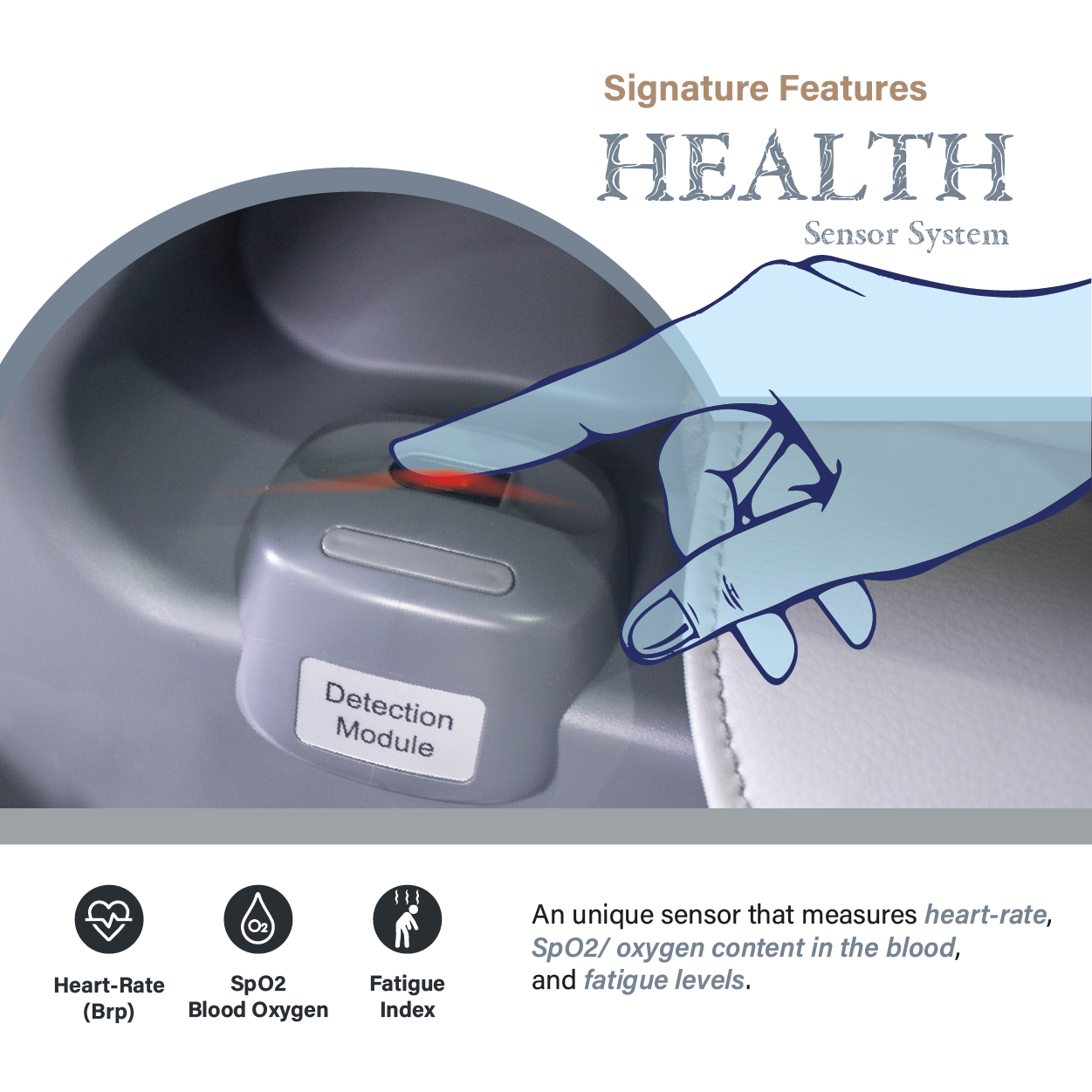 Built-in biometric sensors measure heart rate (BPM), SpO₂ blood oxygen, and fatigue index for real-time wellness tracking.