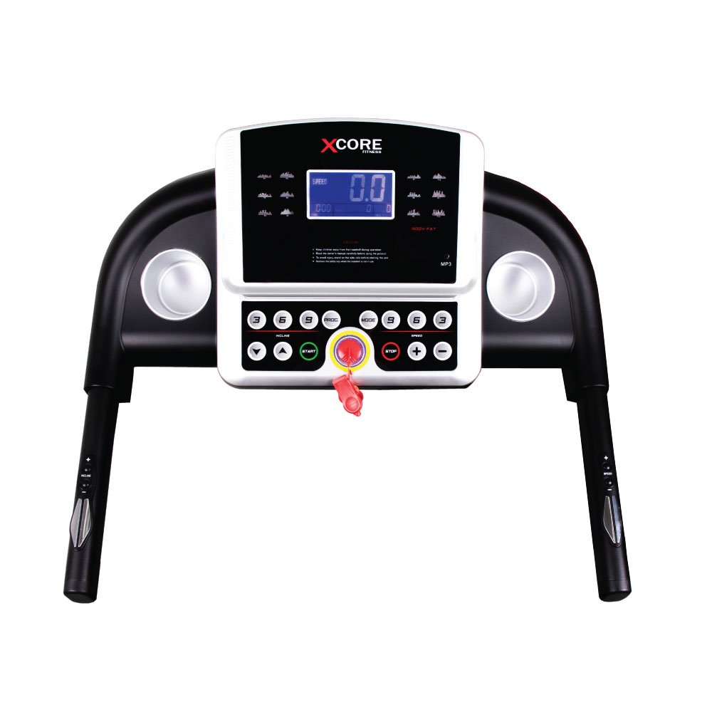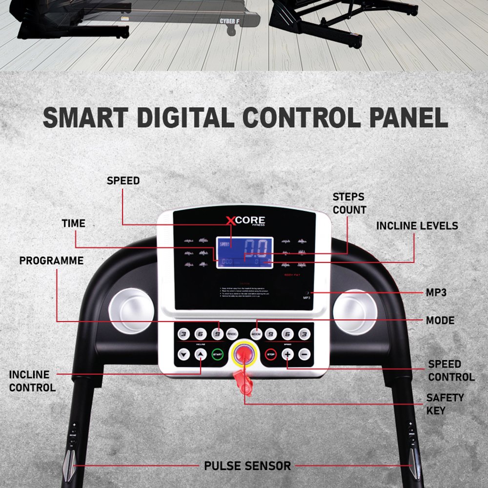 Smart digital console displays speed, time, distance, steps count, incline level, and program mode. Includes speed/incline control buttons, safety key, and MP3 AUX port for entertainment.