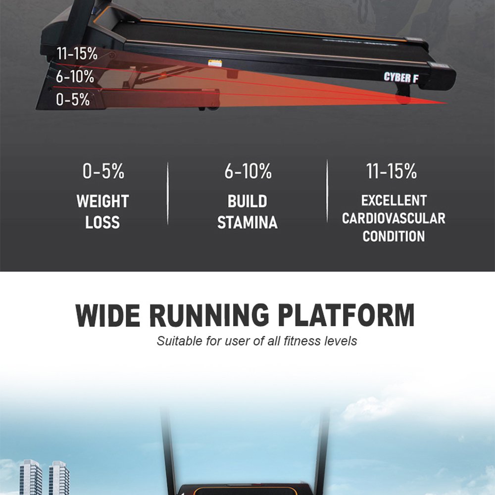 Motorized incline adjustment from 0–15% to simulate uphill training and boost workout intensity.
