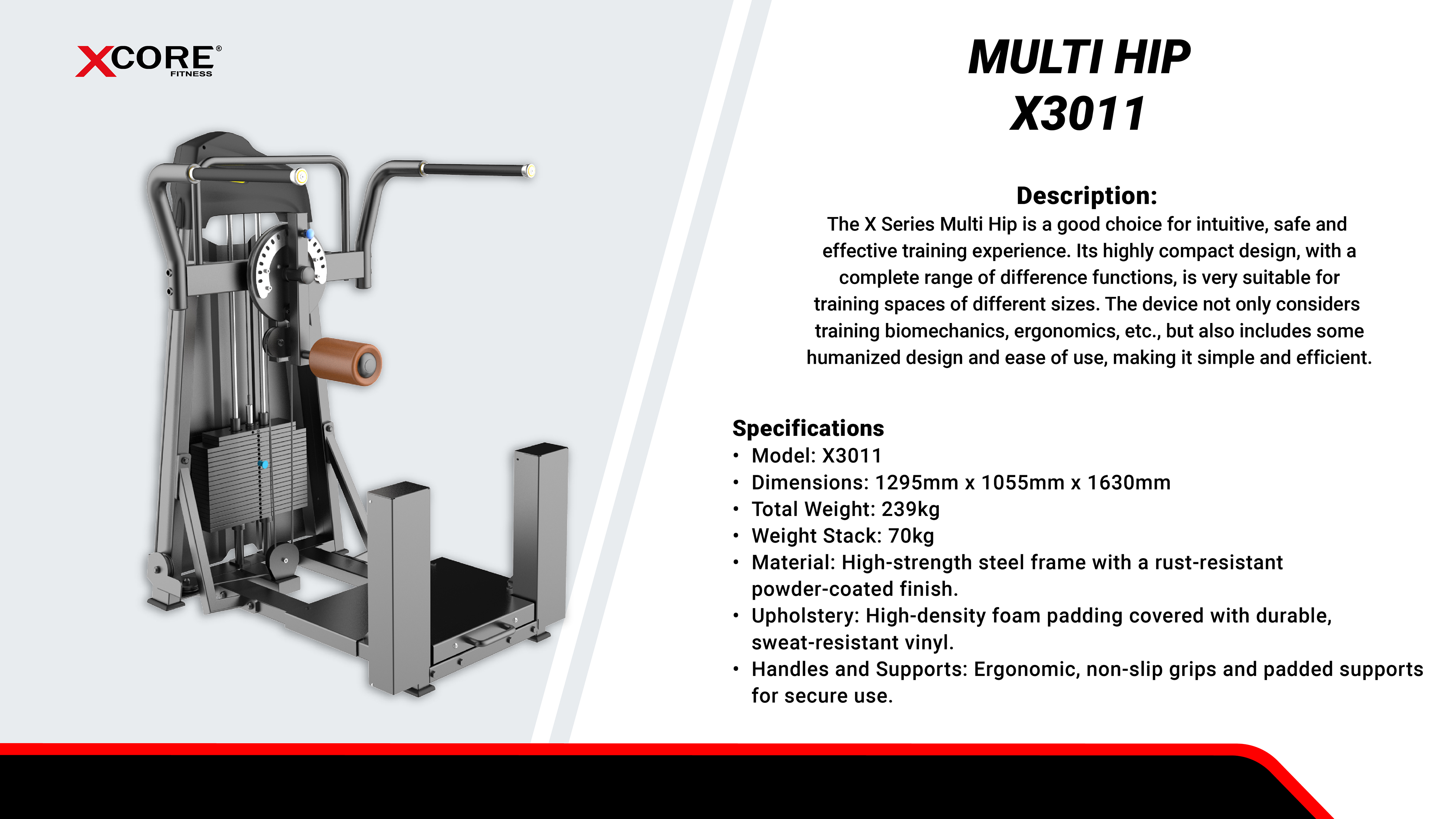 The XCORE X3011 Multi Hip is a versatile and space-efficient machine designed to deliver an intuitive, safe, and effective lower-body training experience. Engineered with precision biomechanics and ergonomic support, this unit allows users to perform a full range of hip exercises, including abduction, adduction, flexion, and extension. Its compact design and human-centered features make it ideal for training spaces of all sizes, ensuring comfort, stability, and smooth performance for every user.