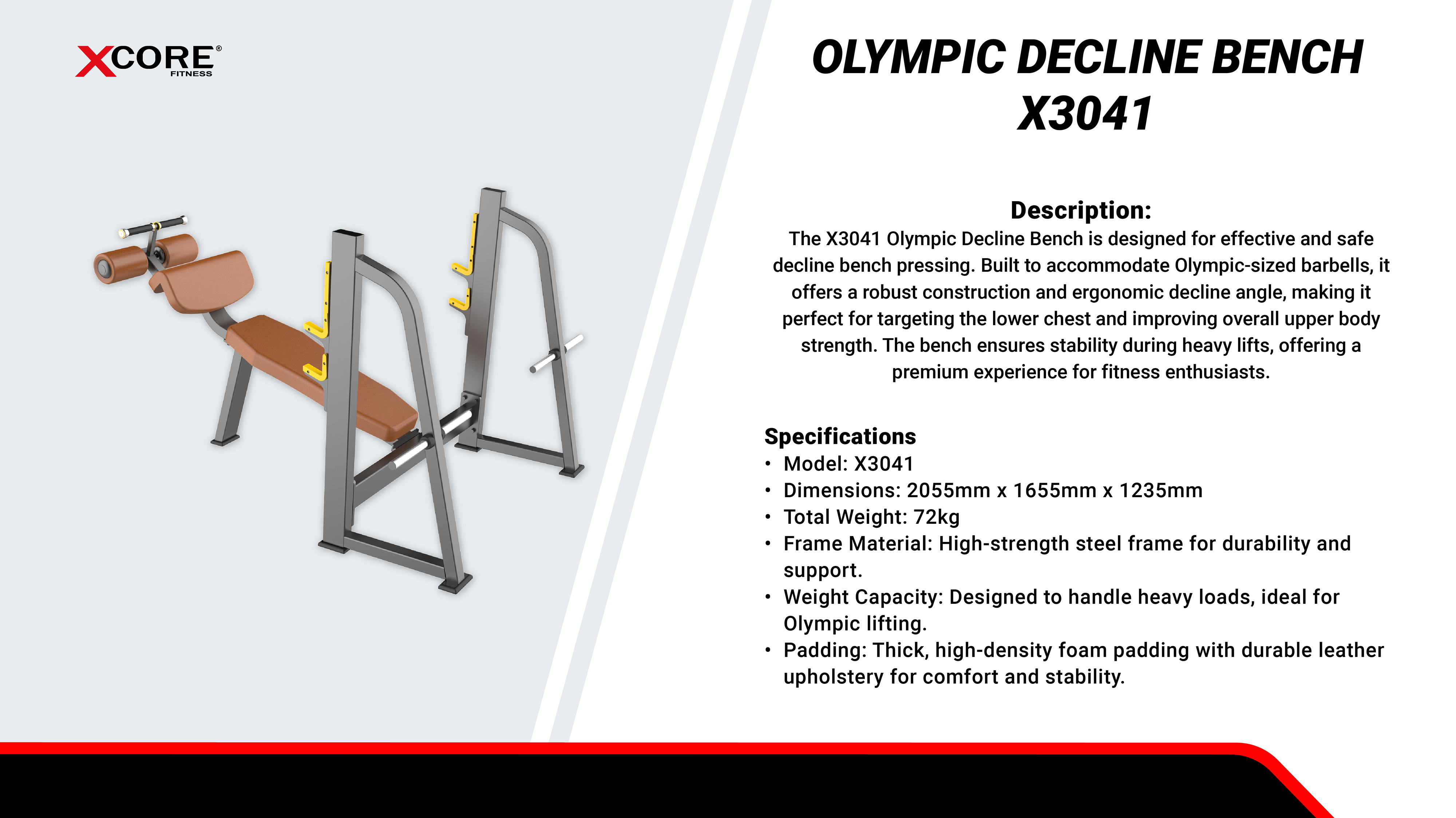 The XCORE X3041 Olympic Decline Bench is purpose-built for lower chest development and safe, controlled decline pressing. With a solid steel frame, ergonomic design, and Olympic barbell compatibility, it delivers exceptional stability and comfort for both commercial and advanced home gyms.