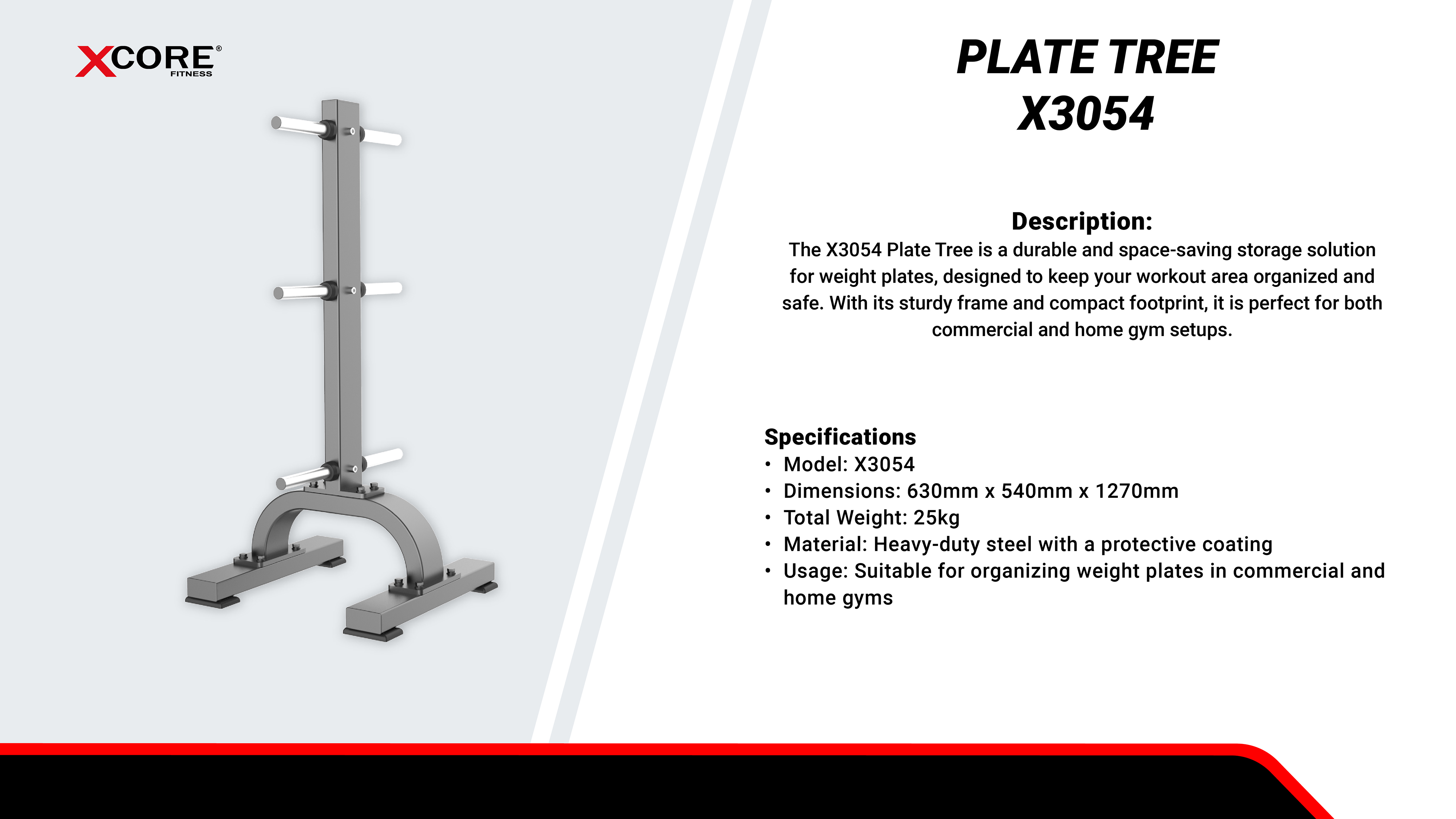 The XCORE X3054 Plate Tree is a compact and sturdy storage solution designed to keep weight plates organized and easily accessible. Ideal for both commercial gyms and home fitness spaces, it maximizes floor space while maintaining a safe and clutter-free workout environment. Its durable construction ensures long-lasting use even under frequent heavy-duty handling.