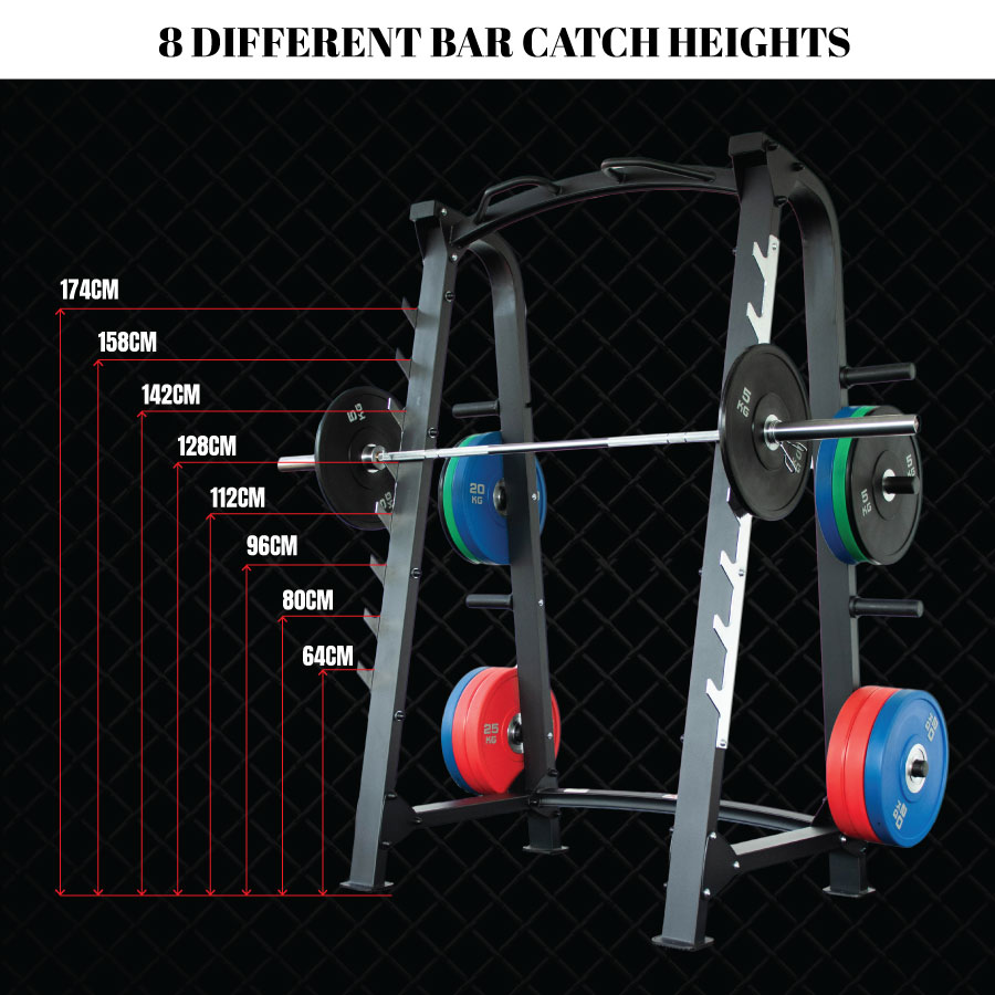 Adjustable heights at 60, 80, 96, 112, 128, 142, 158, and 174 cm — suitable for various exercises and user heights.