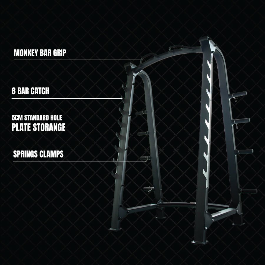 Integrated weight plate storage pegs keep your training area organized and accessible.