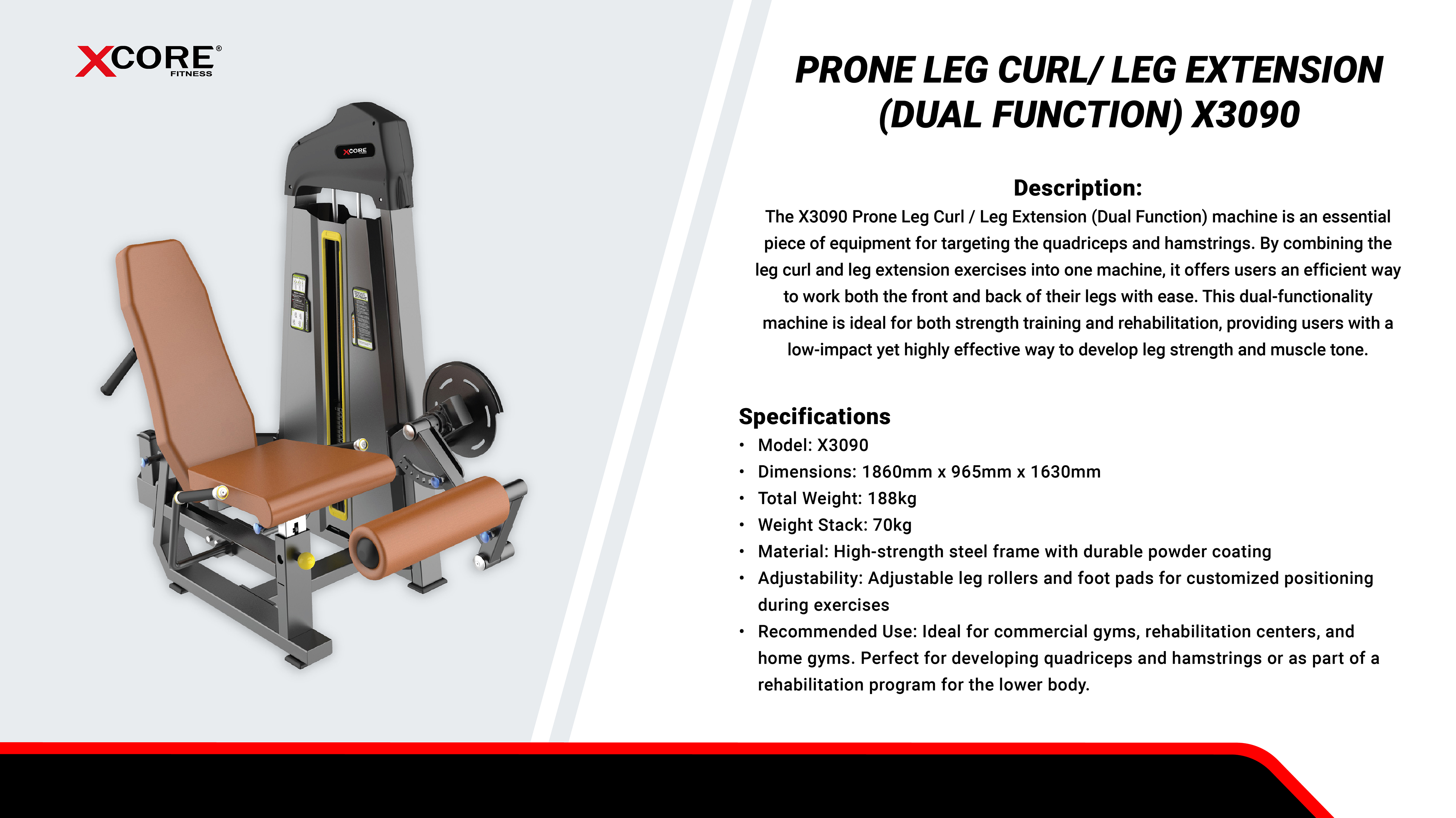 The XCORE X3090 Prone Leg Curl & Leg Extension (Dual Function) provides an efficient and versatile solution for training both the quadriceps and hamstrings. Combining two key lower-body exercises in one compact design, it supports balanced muscle development, strength training, and rehabilitation. Its smooth motion and adjustable features ensure comfort and precision for all fitness levels — ideal for commercial and home gym environments.