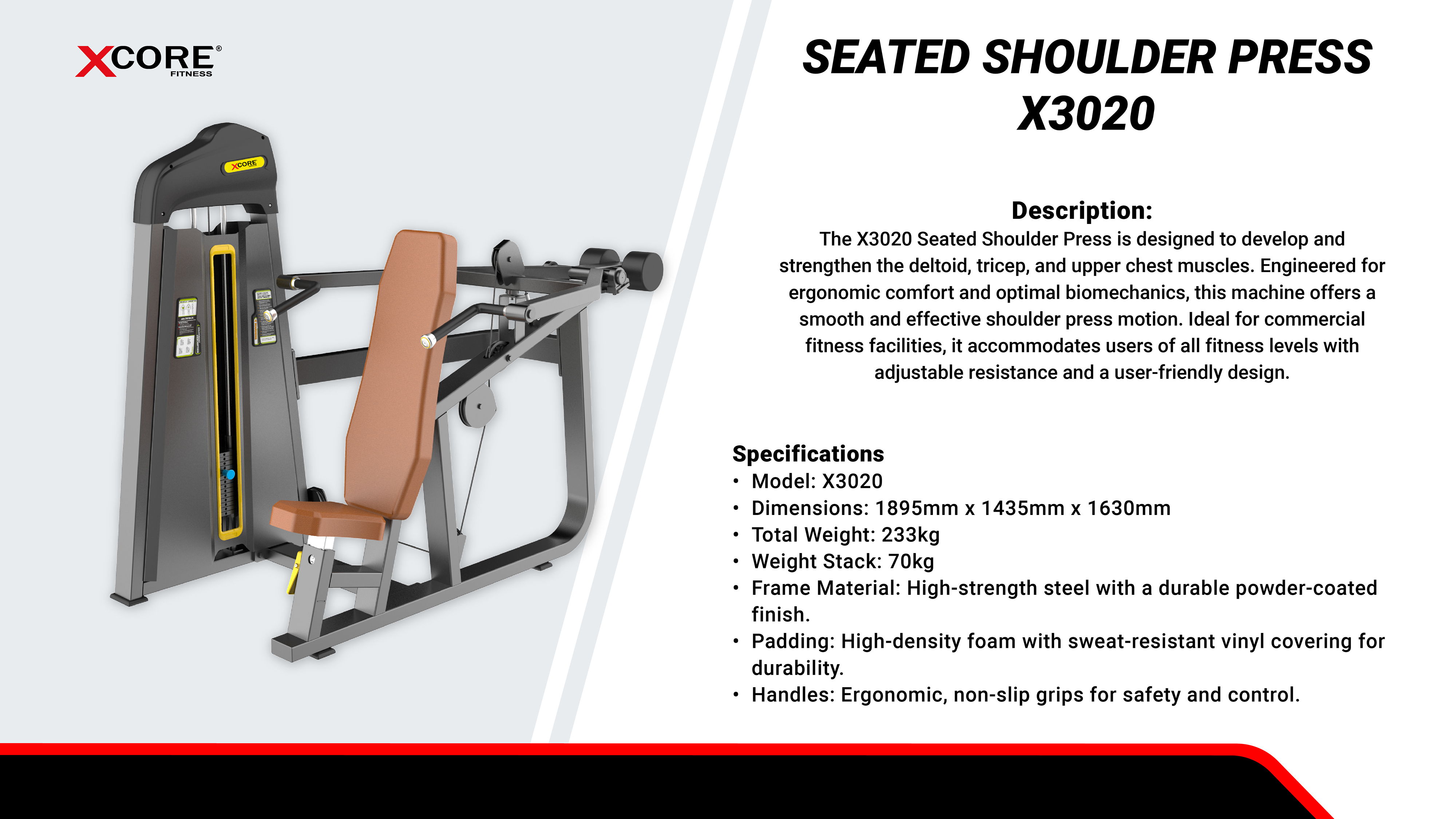 The XCORE X3020 Seated Shoulder Press is engineered to effectively develop and strengthen the deltoids, triceps, and upper chest muscles. With its ergonomic design and biomechanical precision, it delivers a smooth and natural pressing motion. Ideal for commercial gyms and fitness centers, this machine accommodates users of all fitness levels while ensuring comfort, safety, and performance.