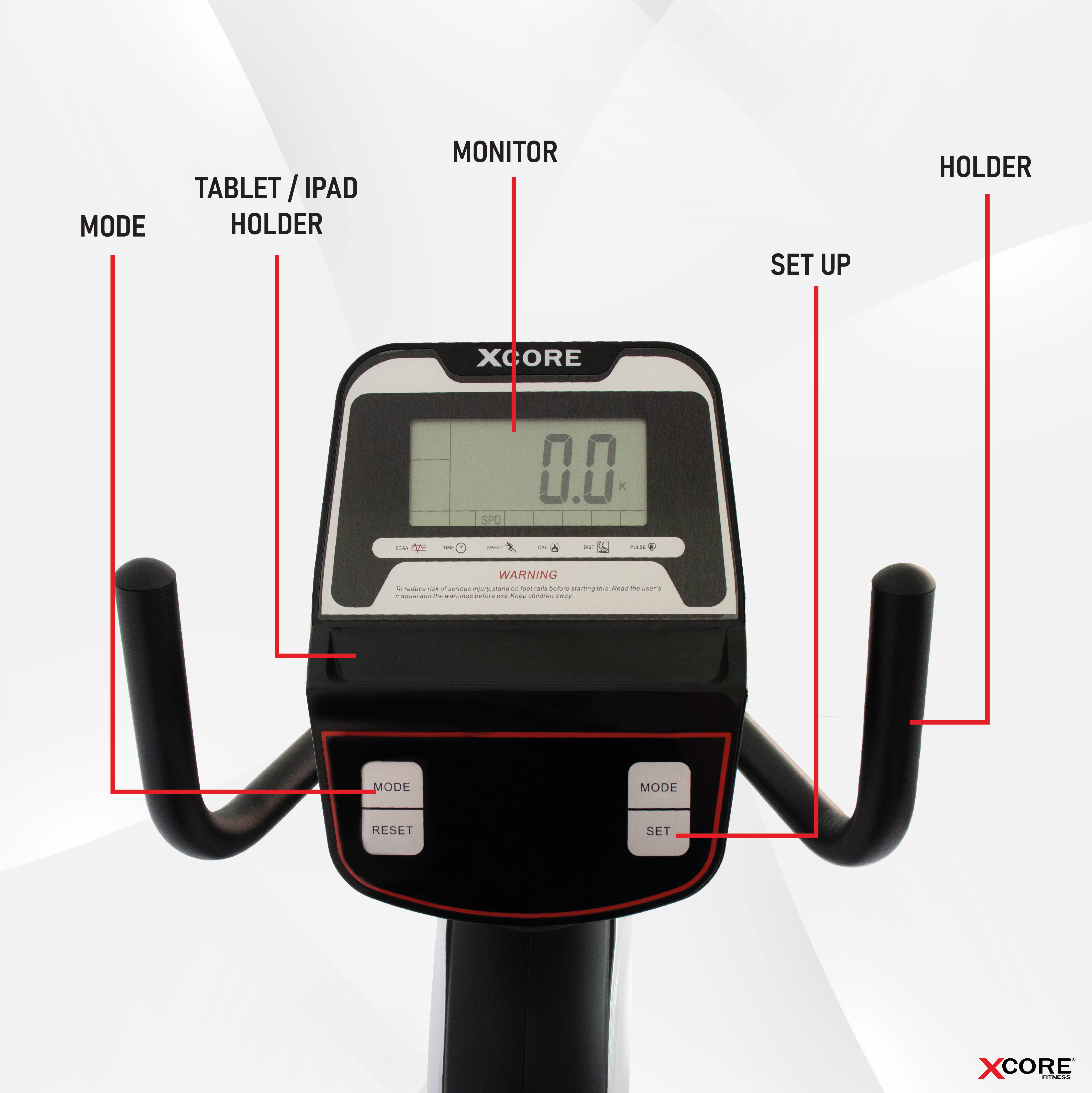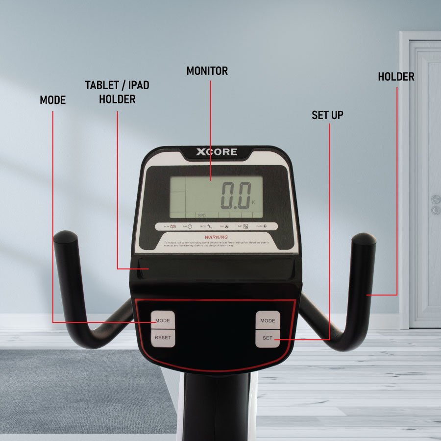 Digital Control Panel with LCD Monitor — includes mode, setup, pulse sensor, and tablet/iPad holder for a convenient and connected workout experience.