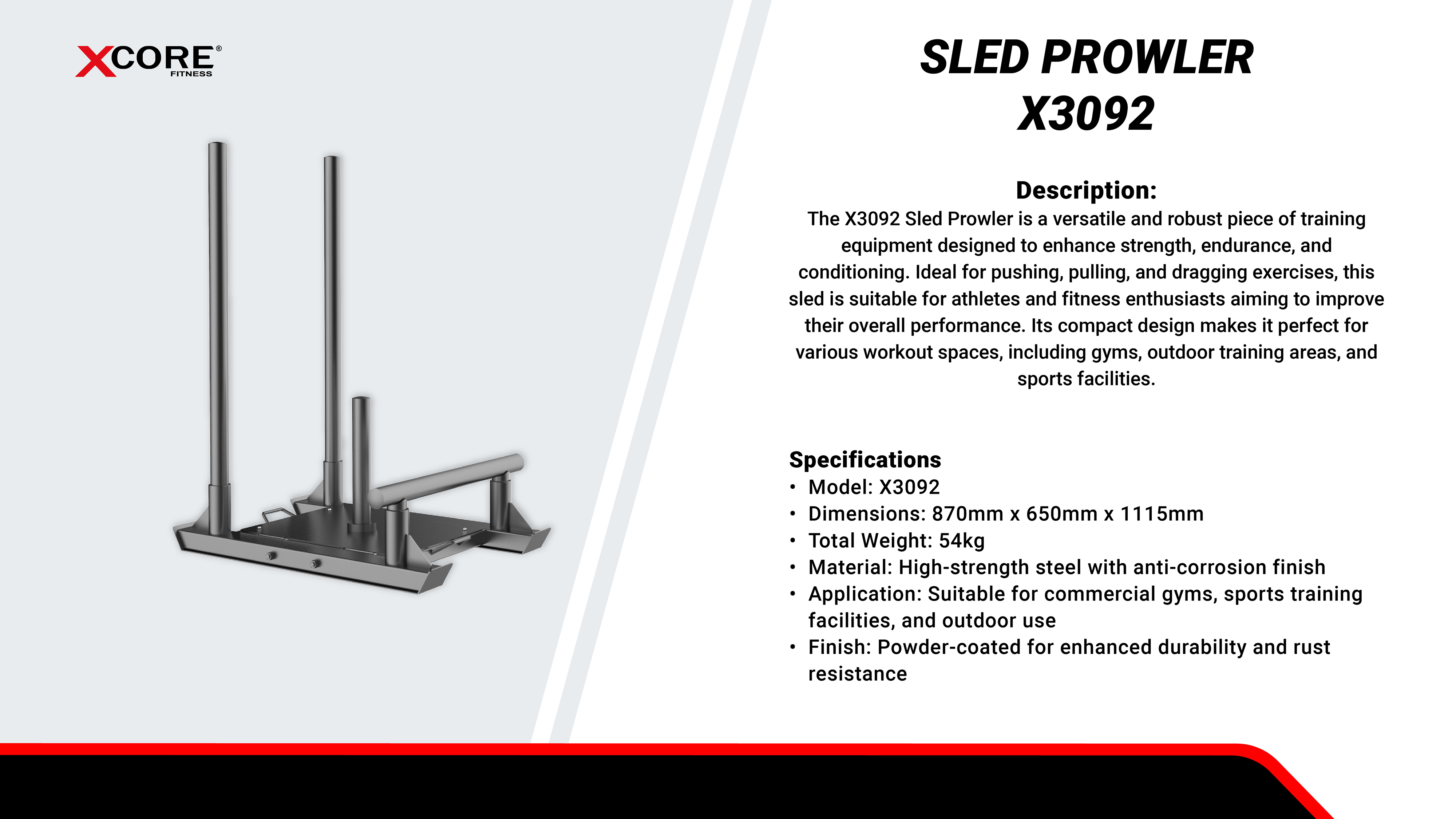 The XCORE X3092 Sled Prowler is a versatile and durable training tool designed to improve strength, endurance, and overall conditioning. Perfect for pushing, pulling, and dragging exercises, it helps athletes and fitness enthusiasts enhance performance. Its compact design makes it suitable for gyms, outdoor training areas, and sports facilities.