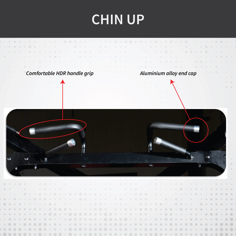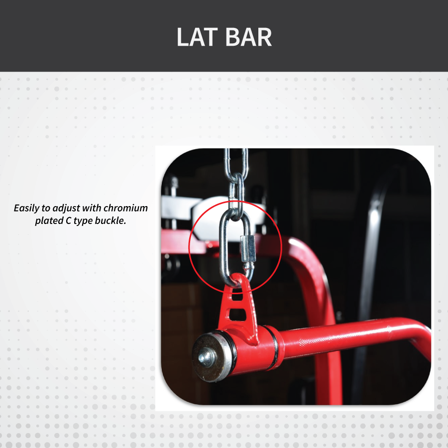 Includes chrome-plated lat bar, C-type buckle, and HDR handle grips with aluminum alloy end caps for comfort and precision.