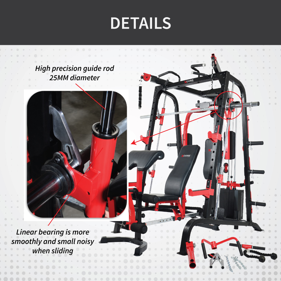 Features 25mm hard chrome-plated guide rods and high-precision linear bearings for silent, fluid movement during training.
