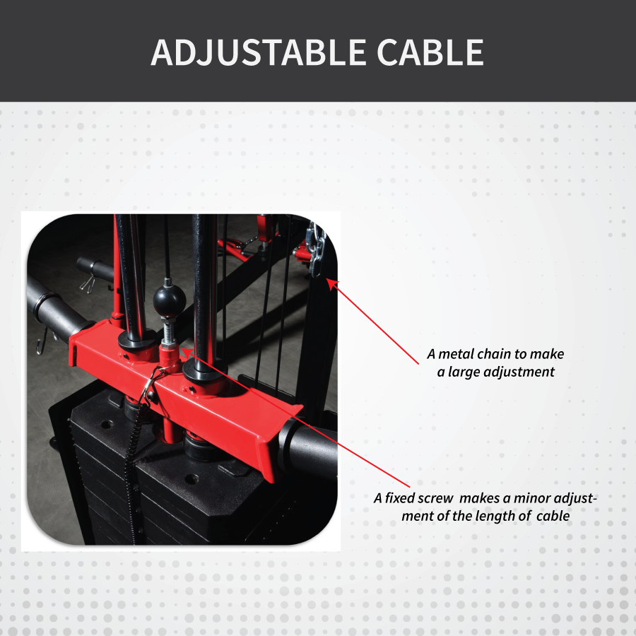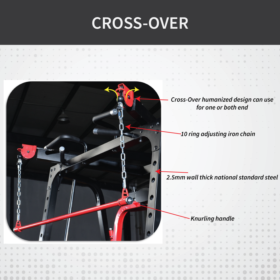 Dual cable crossover with 10-ring adjustable iron chain — allows single or dual-end training with knurled handles for secure grip.