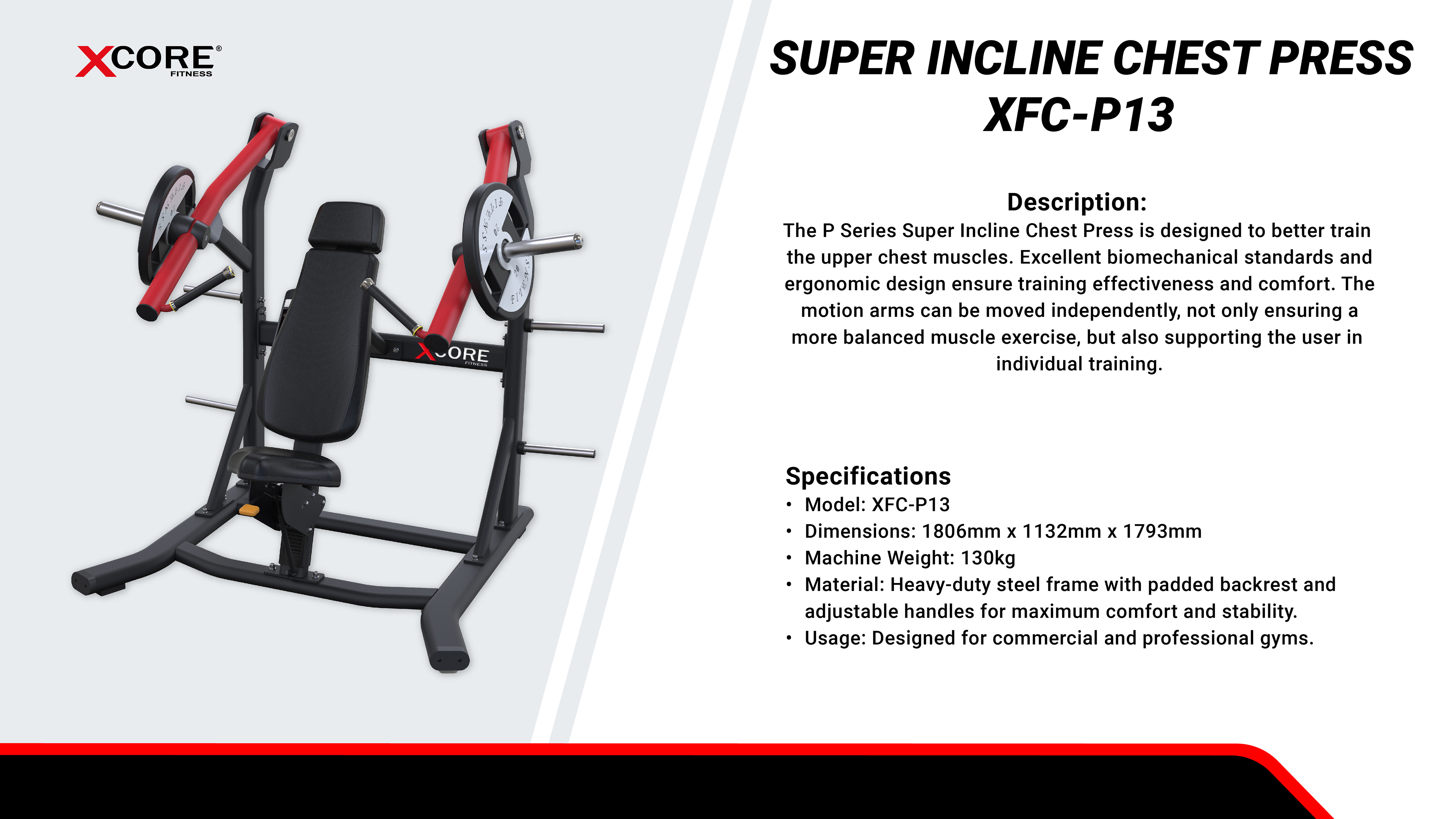 The XCORE P Series Super Incline Chest Press is specifically engineered to target and strengthen the upper chest muscles with superior precision. Built to biomechanical excellence, it provides a natural pressing path that enhances performance while minimizing joint strain.