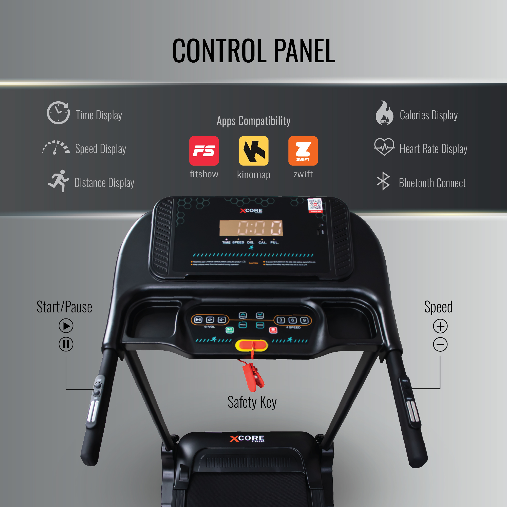 Includes Bluetooth connectivity, safety key, and app compatibility with FitShow, Kinomap, and Zwift.
