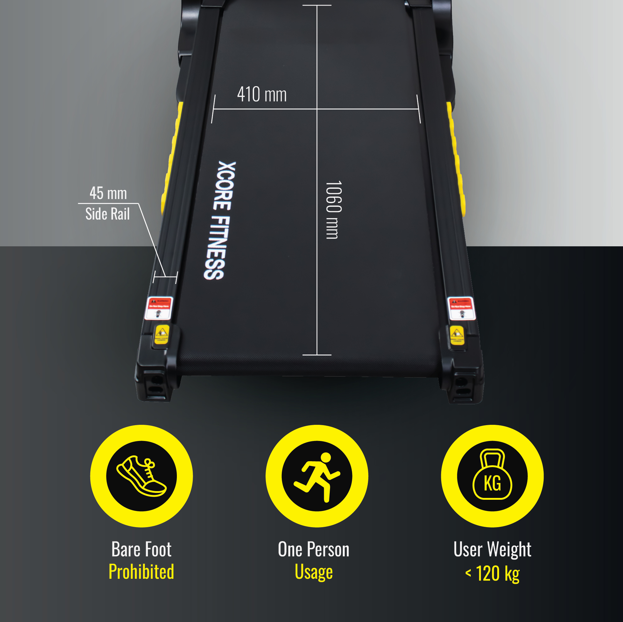 45mm side rails provide stability; designed for single-person use (barefoot running prohibited).