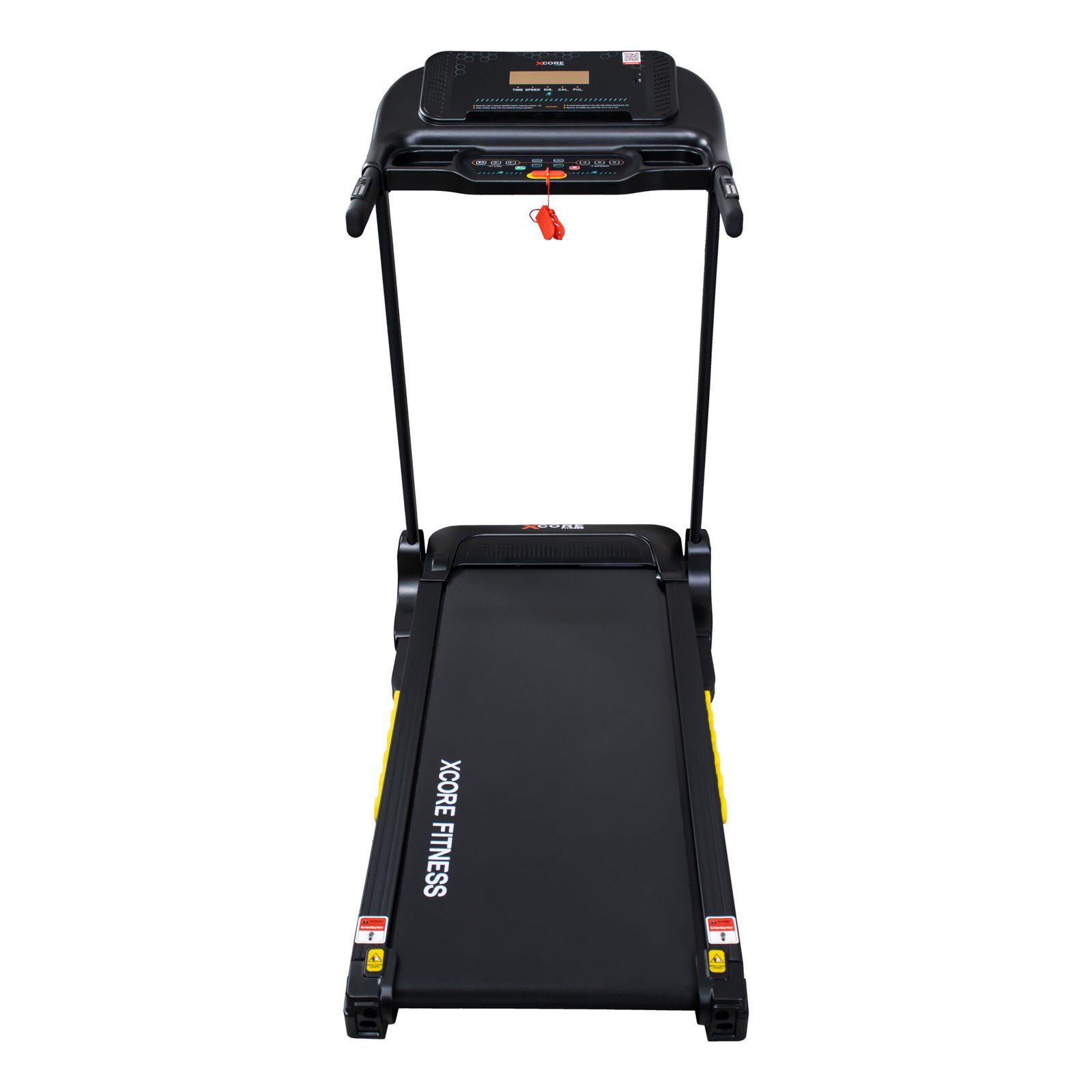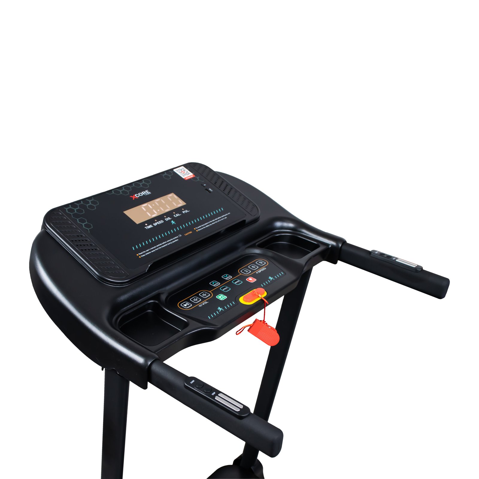 Displays time, speed, distance, calories, and heart rate.