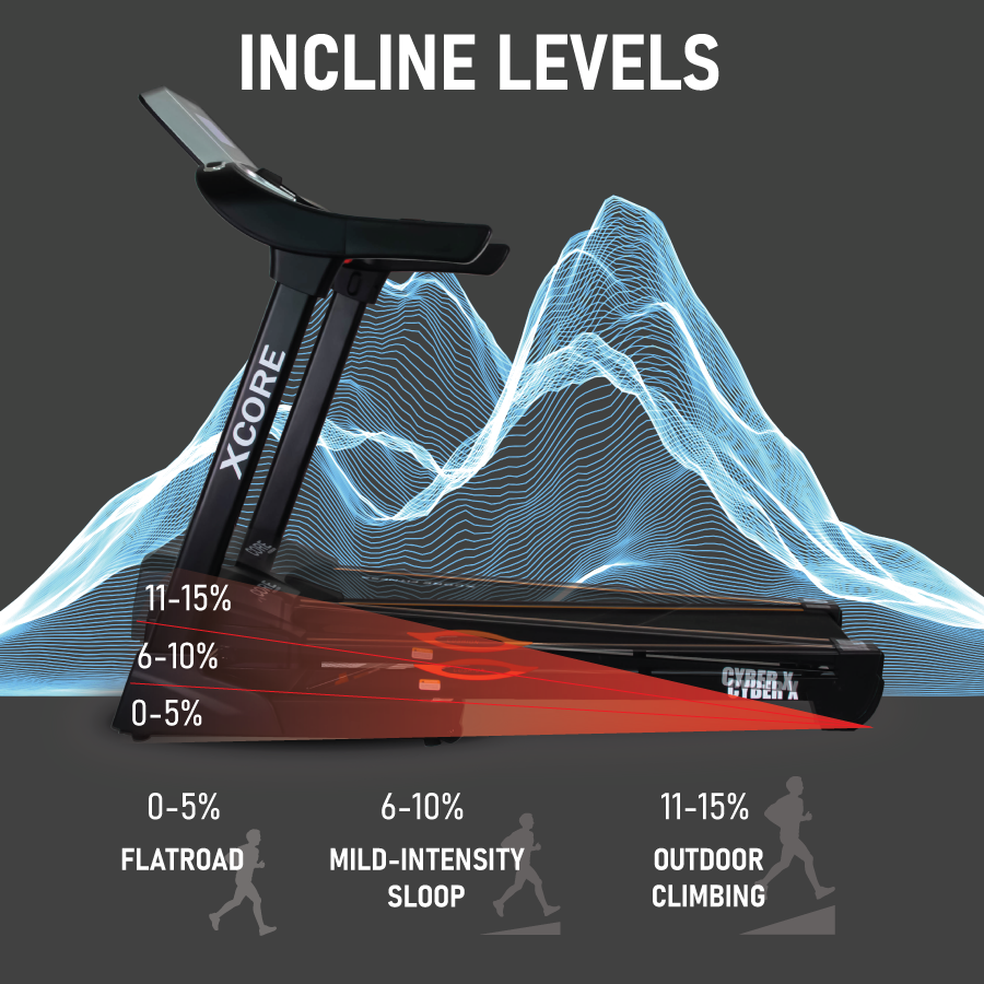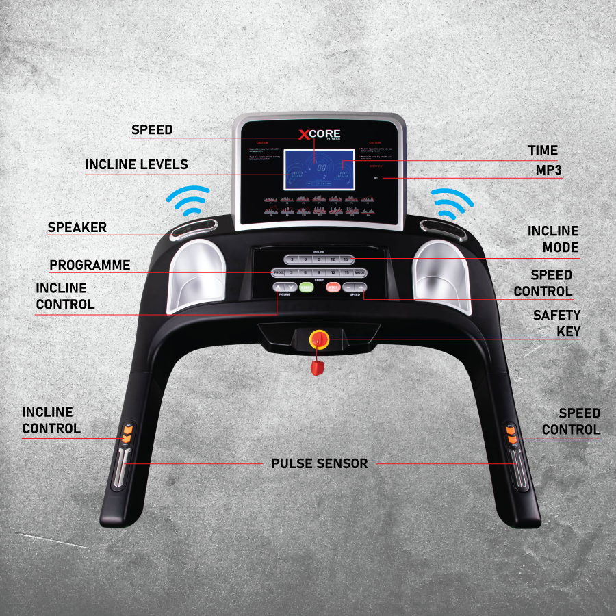 Displays speed, incline, time, program, MP3, pulse sensor, and includes speed & incline control, safety key, and built-in speaker for convenience.