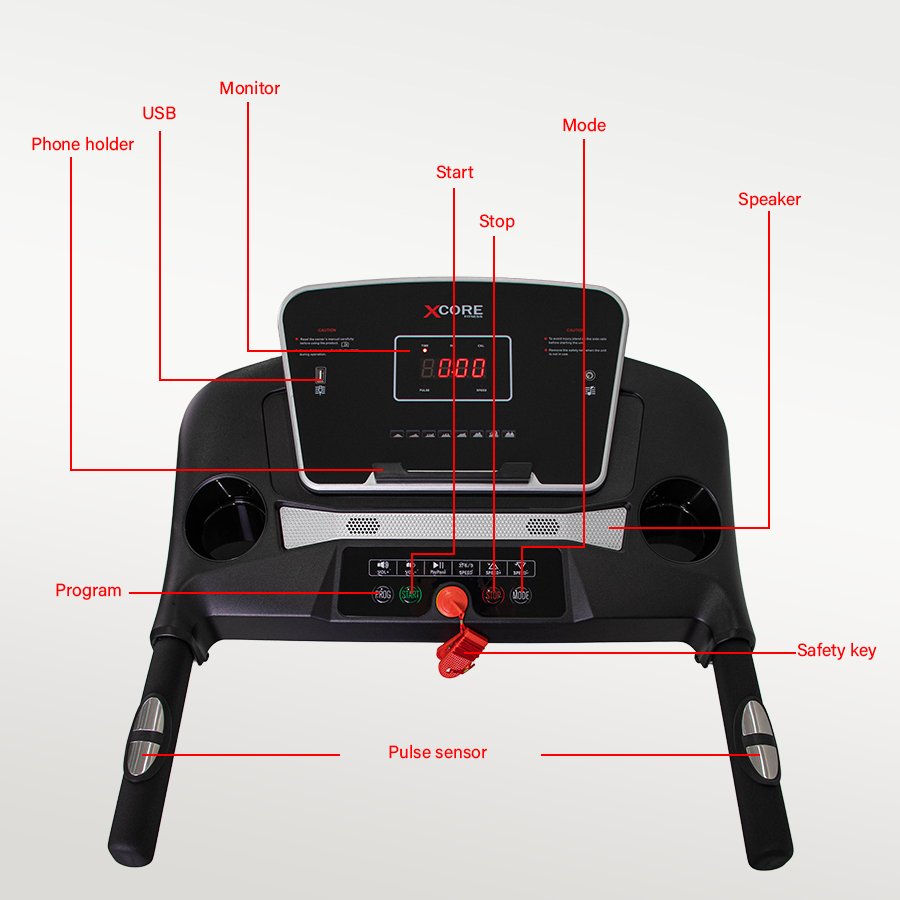 Features start/stop, program, mode, USB port, MP3 speaker, phone holder, and safety key for a convenient, connected training experience.