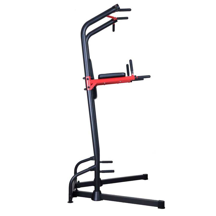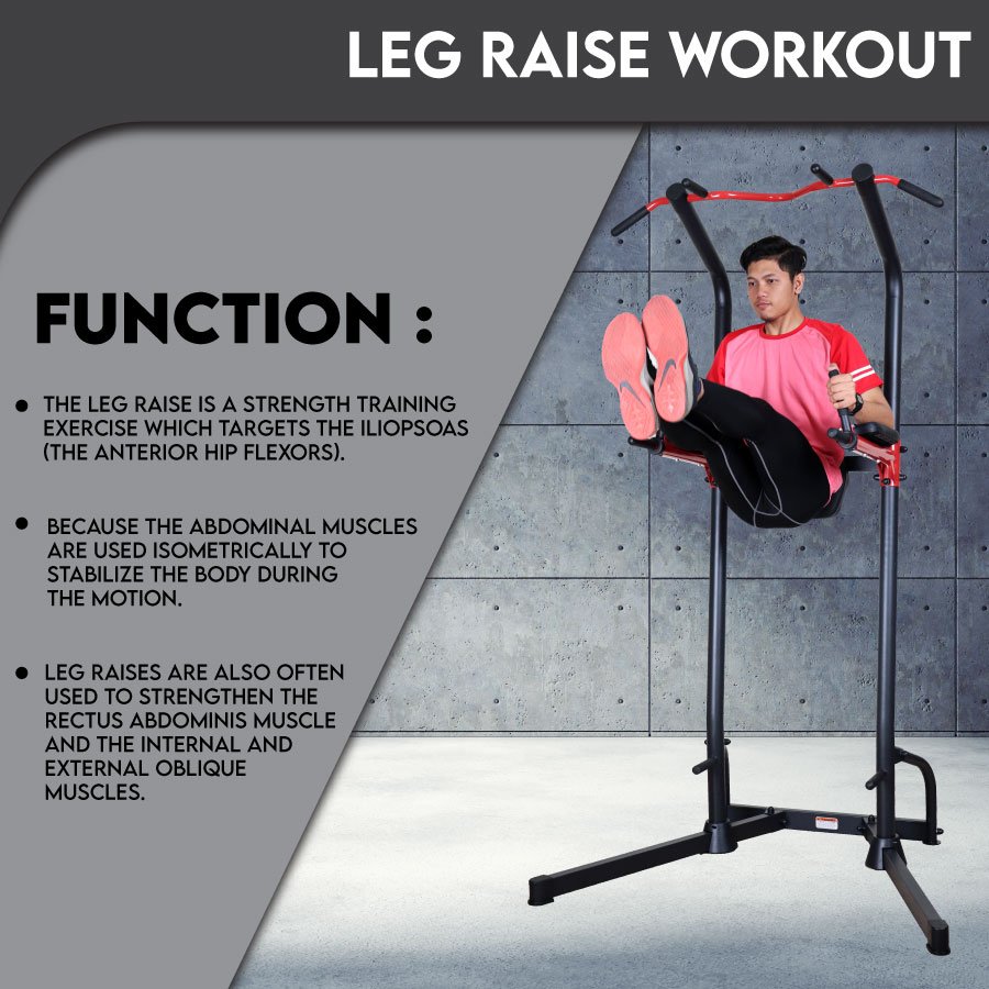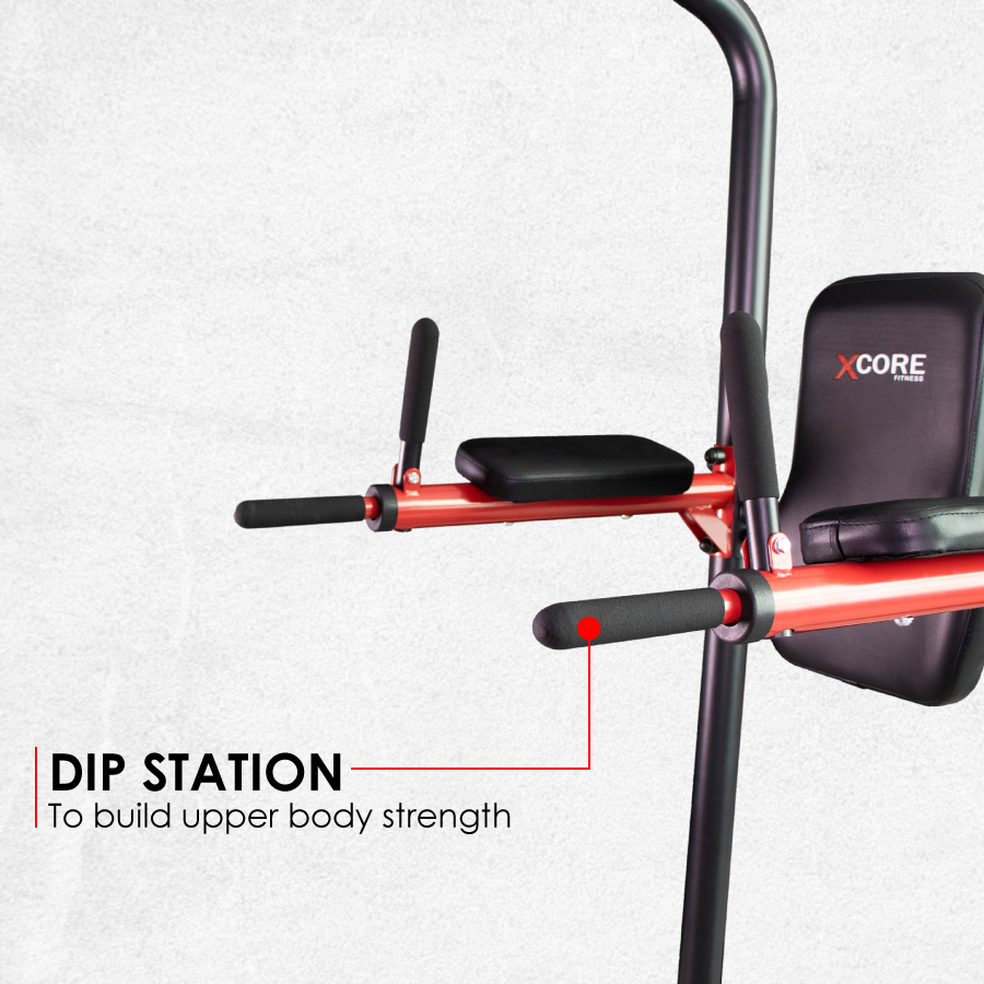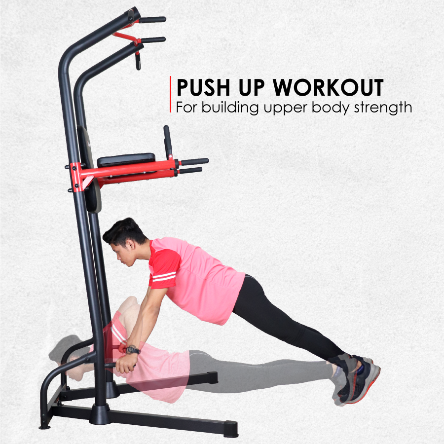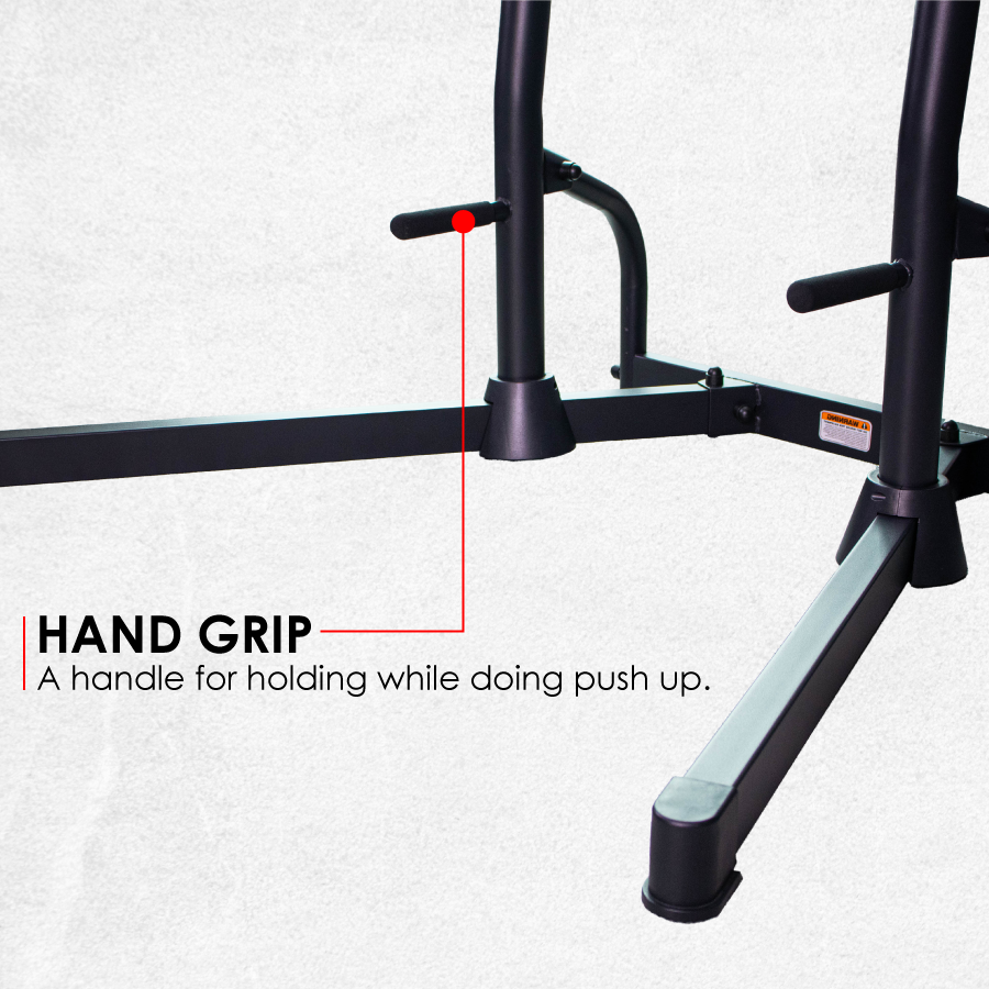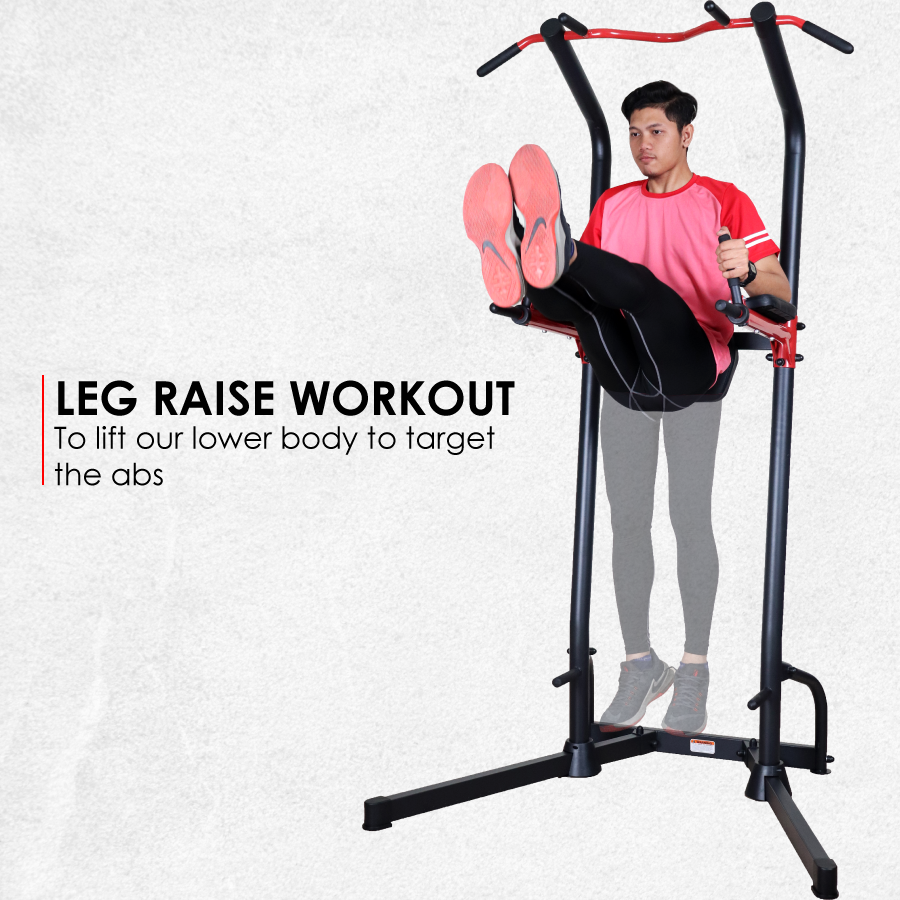Integrates a chin-up bar, dip station, push-up handle, and leg raise station — perfect for a complete upper body and core workout.