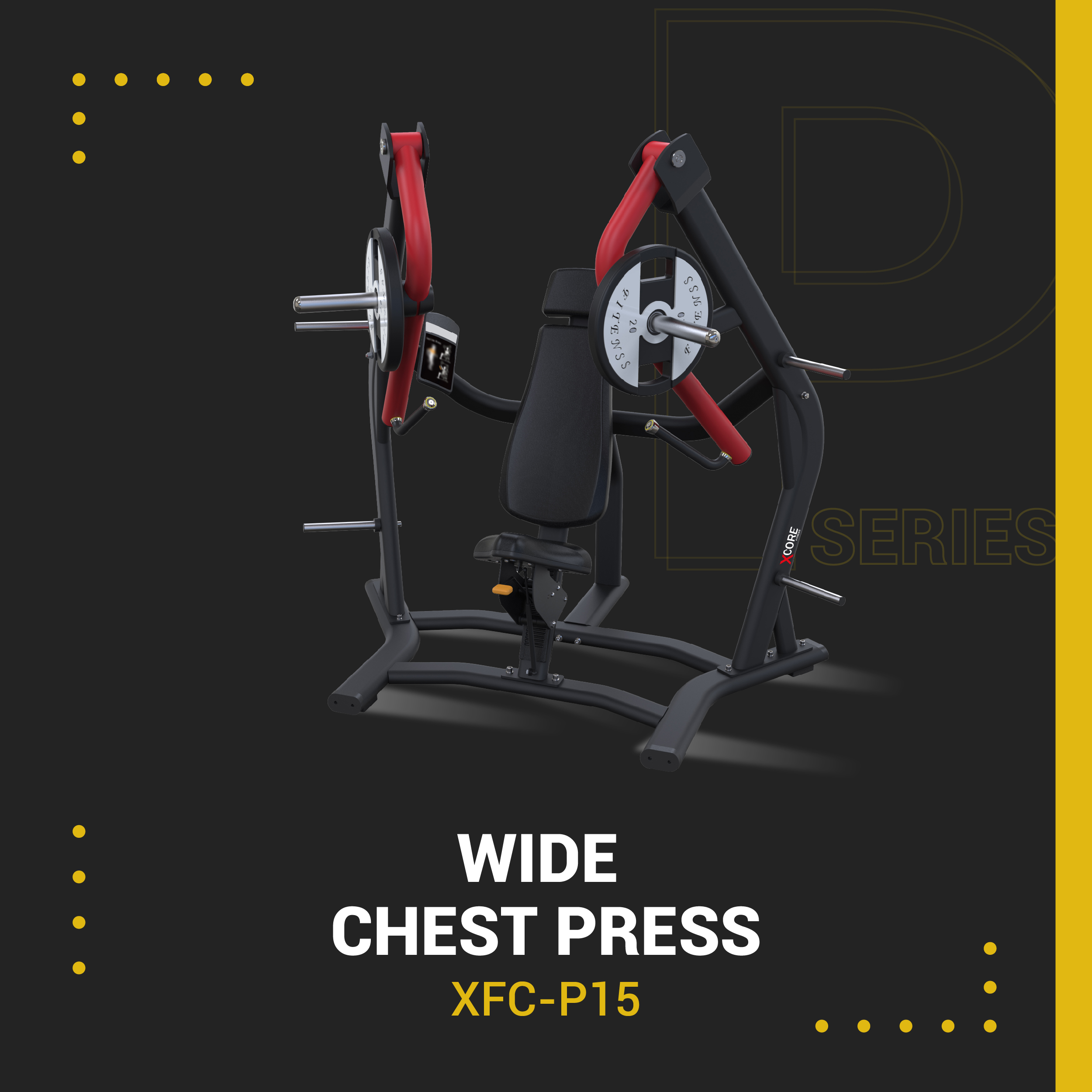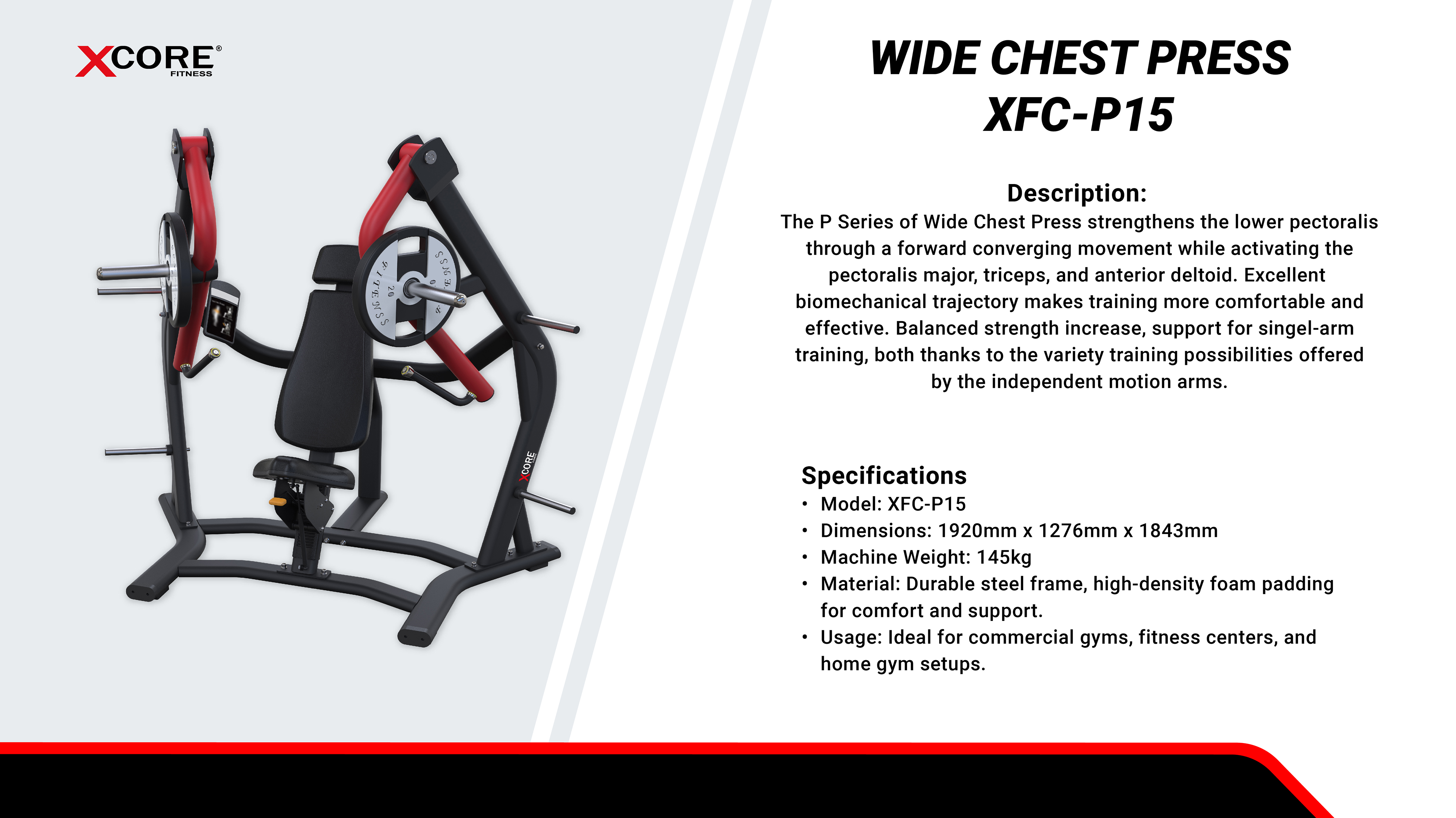 The XCORE P Series Wide Chest Press is designed to strengthen the lower pectoralis through a forward converging motion that effectively engages the pectoralis major, triceps, and anterior deltoids. Engineered with optimal biomechanics, it ensures smooth, natural movement for maximum comfort and muscle activation.